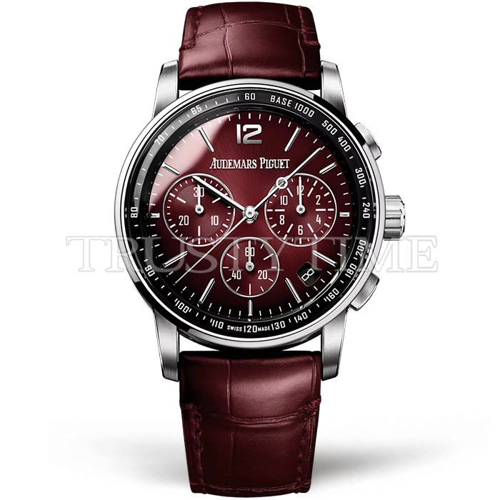 Часы Audemars Piguet из коллекции Code 11.59 Chronograph. Спортивные мужские часы Audemars Piguet Royal CODE 11.59 Chronograph Selfwinding 26393BC.OO.A068CR.01.99 премиального качества (Артикул магазина: AP-1226) оснащены надежным автоматическим механизмом с автоподзаводом (работает от амплитуды движения руки) калибра AP4401, в котором реализованы следующие функции: часовая, минутная и секундная стрелки, а так же хронограф, дата. Круглый корпус часов стального цвета, имеющий размер 41 мм и высоту 12.6 мм превосходно дополнит образ и украсит запястье своего обладателя. Для изготовления часов Audemars Piguet Royal CODE 11.59 Chronograph Selfwinding 26393BC.OO.A068CR.01.99 предлагаемых в нашем интернет-магазине, применяются нержавеющая сталь 316L высокого качества (Швейцарский стандарт), а так же сапфировое стекло высокой прочности, благодаря чему обеспечивается максимальная защита от сколов и механических повреждений. Отличительной чертой данной модели является бордовый циферблат, часовые индексы которого обеспечивают часовые метки. Завершает образ кожаный ремешок бордового цвета с фирменной классической застежкой Audemars Piguet. Водонепроницаемость данной модели составляет 30М (WR30) – допускается минимальное воздействие с водой.