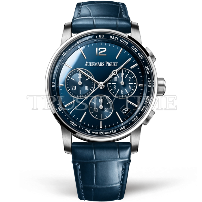 Часы Audemars Piguet из коллекции Code 11.59 Chronograph. Спортивные мужские часы Audemars Piguet Royal CODE 11.59 Chronograph Selfwinding 26393BC.OO.A321CR.01 премиального качества (Артикул магазина: AP-1227) оснащены надежным автоматическим механизмом с автоподзаводом (работает от амплитуды движения руки) калибра AP4401, в котором реализованы следующие функции: часовая, минутная и секундная стрелки, а так же дата, хронограф с функцией flyback (мгновенный перезапуск) в наручных часах (chronograph) — это усложнение, которое позволяет мгновенно сбрасывать показания секундомера одним нажатием кнопки. В обычных хронографах для сброса показаний нужно сначала остановить часы, а затем начать заново. Круглый корпус часов стального цвета, имеющий размер 41 мм и высоту 12.6 мм превосходно дополнит образ и украсит запястье своего обладателя. Для изготовления часов Audemars Piguet Royal CODE 11.59 Chronograph Selfwinding 26393BC.OO.A321CR.01 предлагаемых в нашем интернет-магазине, применяются нержавеющая сталь 316L высокого качества (Швейцарский стандарт), а так же сапфировое стекло высокой прочности, благодаря чему обеспечивается максимальная защита от сколов и механических повреждений. Отличительной чертой данной модели является синий циферблат, часовые индексы которого обеспечивают часовые метки. Завершает образ кожаный ремешок синего цвета с фирменной классической застежкой Audemars Piguet. Водонепроницаемость данной модели составляет 30М (WR30) – допускается минимальное воздействие с водой.