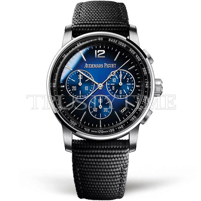 Часы Audemars Piguet из коллекции Code 11.59 Chronograph. Спортивные мужские часы Audemars Piguet Royal CODE 11.59 Chronograph Selfwinding 26393BC.OO.A002KB.01 премиального качества (Артикул магазина: AP-1230) оснащены надежным автоматическим механизмом с автоподзаводом (работает от амплитуды движения руки) калибра AP4401, в котором реализованы следующие функции: часовая, минутная и секундная стрелки, а так же хронограф, дата. Круглый корпус часов стального цвета, имеющий размер 41 мм и высоту 12.6 мм превосходно дополнит образ и украсит запястье своего обладателя. Для изготовления часов Audemars Piguet Royal CODE 11.59 Chronograph Selfwinding 26393BC.OO.A002KB.01 предлагаемых в нашем интернет-магазине, применяются нержавеющая сталь 316L высокого качества (Швейцарский стандарт), а так же сапфировое стекло высокой прочности, благодаря чему обеспечивается максимальная защита от сколов и механических повреждений. Отличительной чертой данной модели является синий циферблат, часовые индексы которого обеспечивают часовые метки. Завершает образ нейлоновый ремешок черного цвета с фирменной классической застежкой Audemars Piguet. Водонепроницаемость данной модели составляет 30М (WR30) – допускается минимальное воздействие с водой.