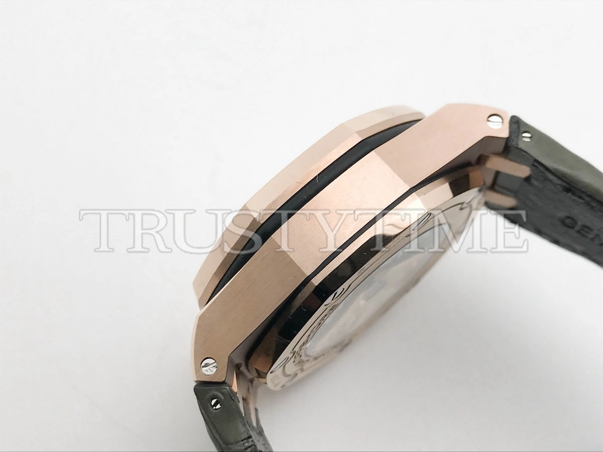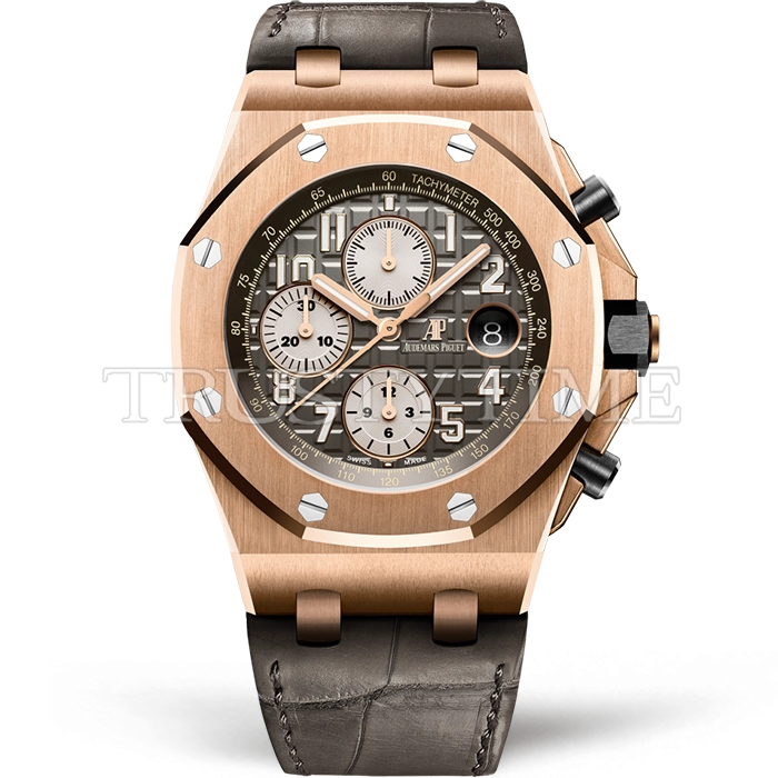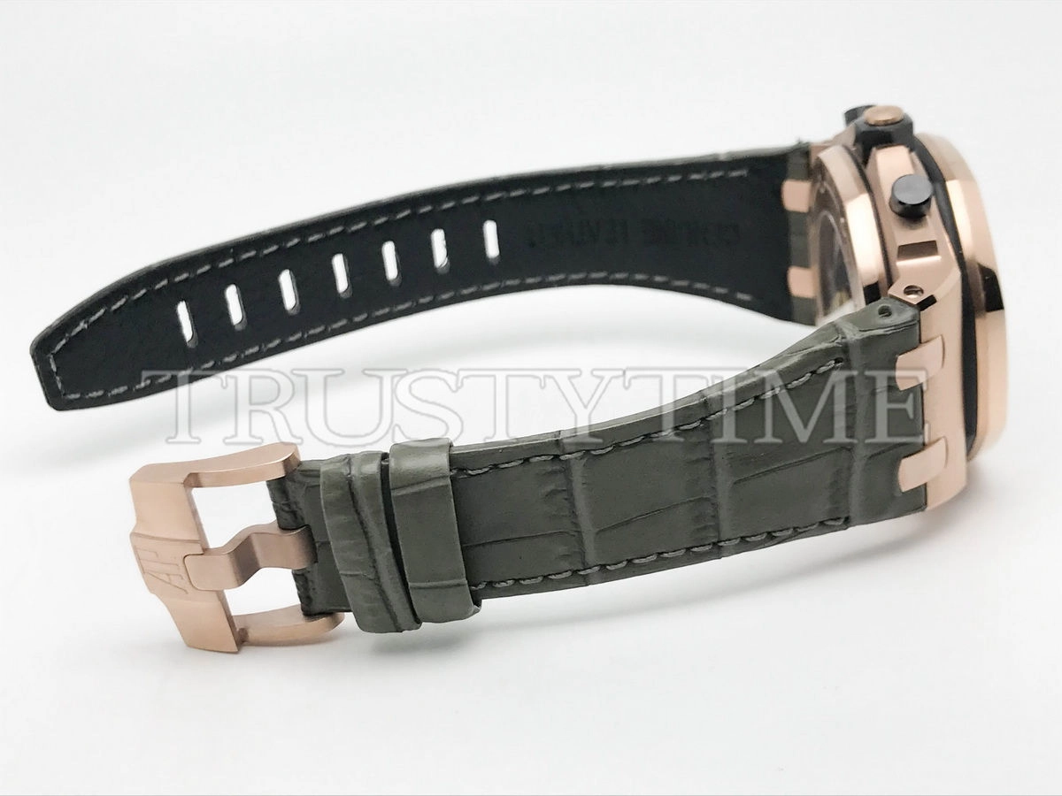 Часы Audemars Piguet из коллекции Royal Oak Offshore Chronograph. Спортивные мужские часы Audemars Piguet Royal Oak Offshore Chronograph 26470OR.OO.A125CR.01 премиального качества (Артикул магазина: AP-1116) оснащены надежным автоматическим механизмом с автоподзаводом (работает от амплитуды движения руки) калибра AP3126, в котором реализованы следующие функции: часовая, минутная и секундная стрелки, а так же хронограф, дата. Восьмиугольный корпус часов розового цвета, имеющий размер 42 мм и высоту 16 мм превосходно дополнит образ и украсит запястье своего обладателя. Для изготовления часов Audemars Piguet Royal Oak Offshore Chronograph 26470OR.OO.A125CR.01 предлагаемых в нашем интернет-магазине, применяются нержавеющая сталь 316F высокого качества (Швейцарский стандарт), а так же сапфировое стекло высокой прочности, благодаря чему обеспечивается максимальная защита от сколов и механических повреждений. Отличительной чертой данной модели является серый циферблат, часовые индексы которого обеспечивают арабские цифры. Завершает образ кожаный ремешок коричневого цвета с фирменной классической застежкой Audemars Piguet. Водонепроницаемость данной модели составляет 30М (WR30) – допускается минимальное воздействие с водой.