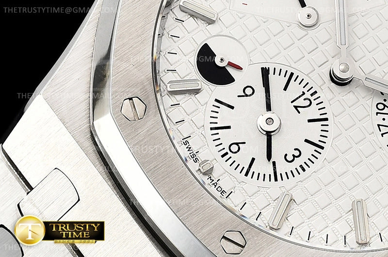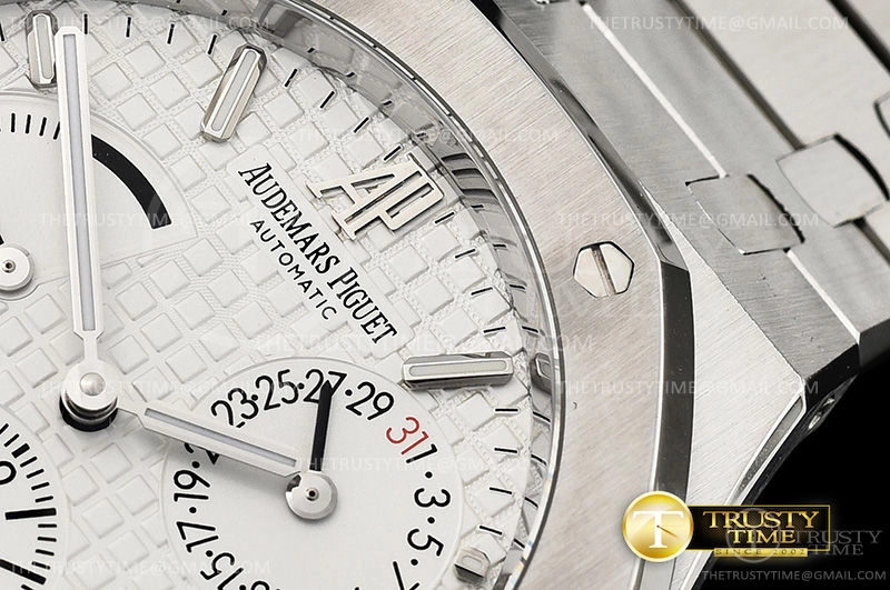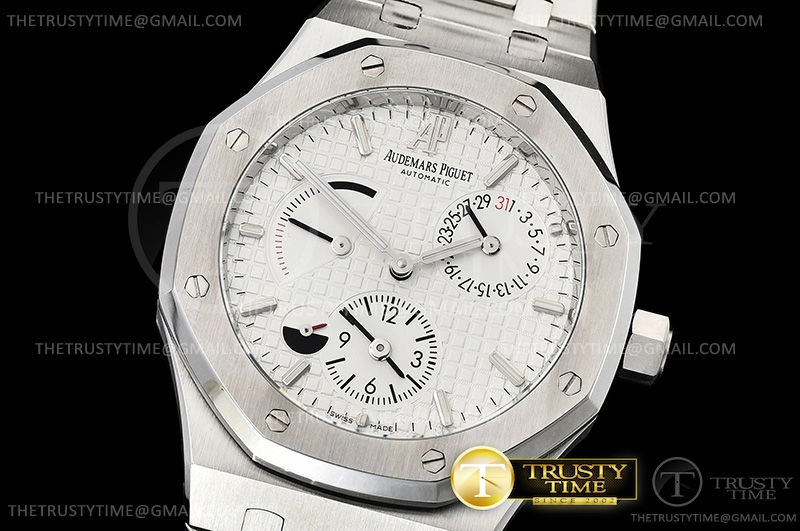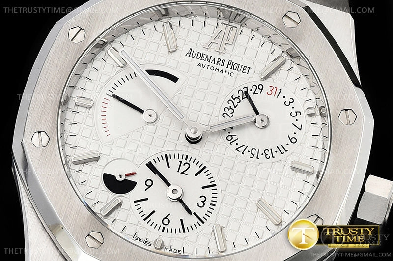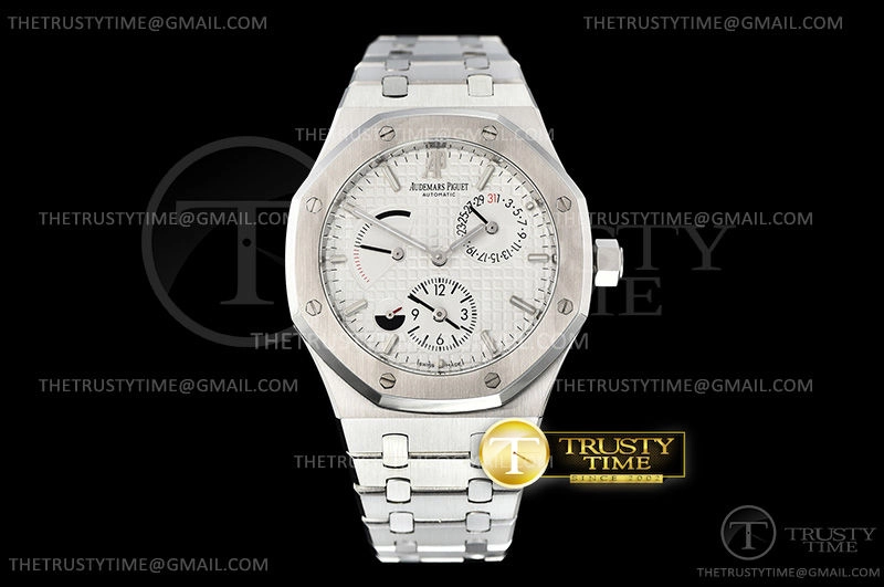 Часы Audemars Piguet из коллекции Royal Oak Dual Time. Классические мужские часы Audemars Piguet Royal Oak Dual Time 26120ST.OO.1220ST.01 премиального качества (Артикул магазина: AP-0825) оснащены надежным автоматическим механизмом с автоподзаводом (работает от амплитуды движения руки) калибра MY9015, в котором реализованы следующие функции: часова и минутка стрелки, а так же дата, день-ночь, двойное время (GMT), резерв хода. Восьмиугольный корпус часов стального цвета, имеющий размер 43 мм и высоту 13 мм превосходно дополнит образ и украсит запястье своего обладателя. Для изготовления часов Audemars Piguet Royal Oak Dual Time 26120ST.OO.1220ST.01 предлагаемых в нашем интернет-магазине, применяются нержавеющая сталь 316L высокого качества (Швейцарский стандарт), а так же сапфировое стекло высокой прочности, благодаря чему обеспечивается максимальная защита от сколов и механических повреждений. Отличительной чертой данной модели является белый циферблат, часовые индексы которого обеспечивают часовые метки. Завершает образ браслет из нержавеющей стали стального цвета с фирменной раскладывающейся застежкой Audemars Piguet. Водонепроницаемость данной модели составляет 30М (WR30) – допускается минимальное воздействие с водой.