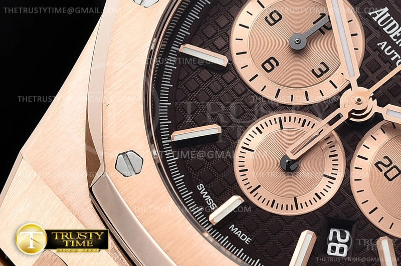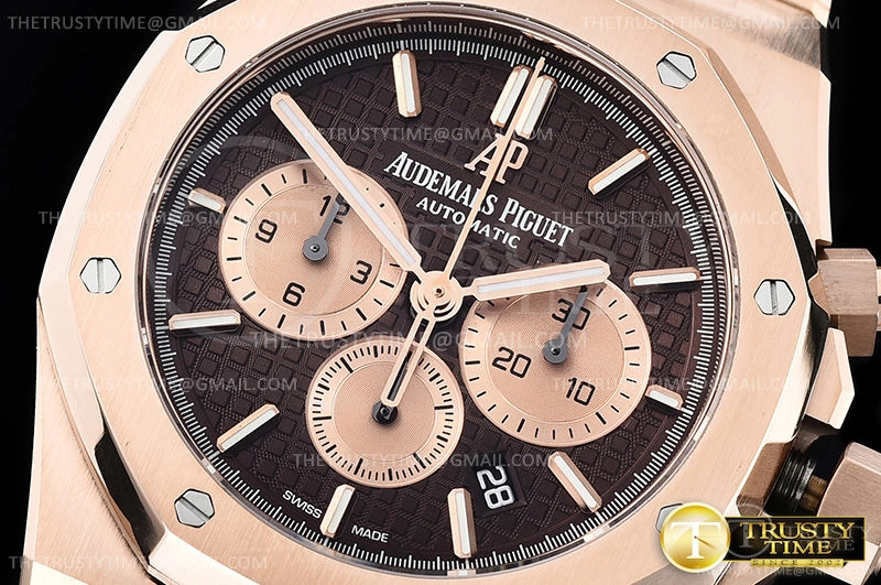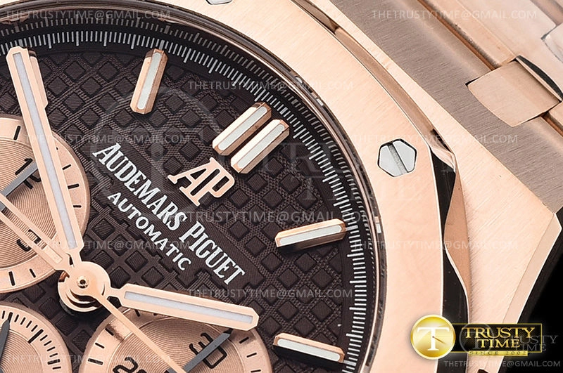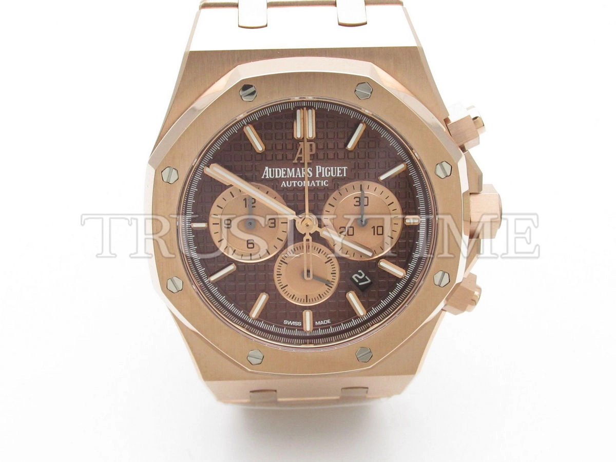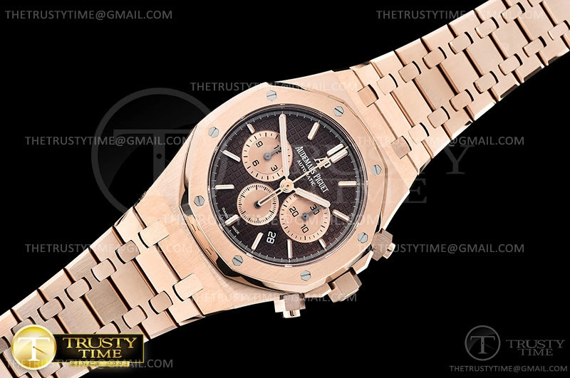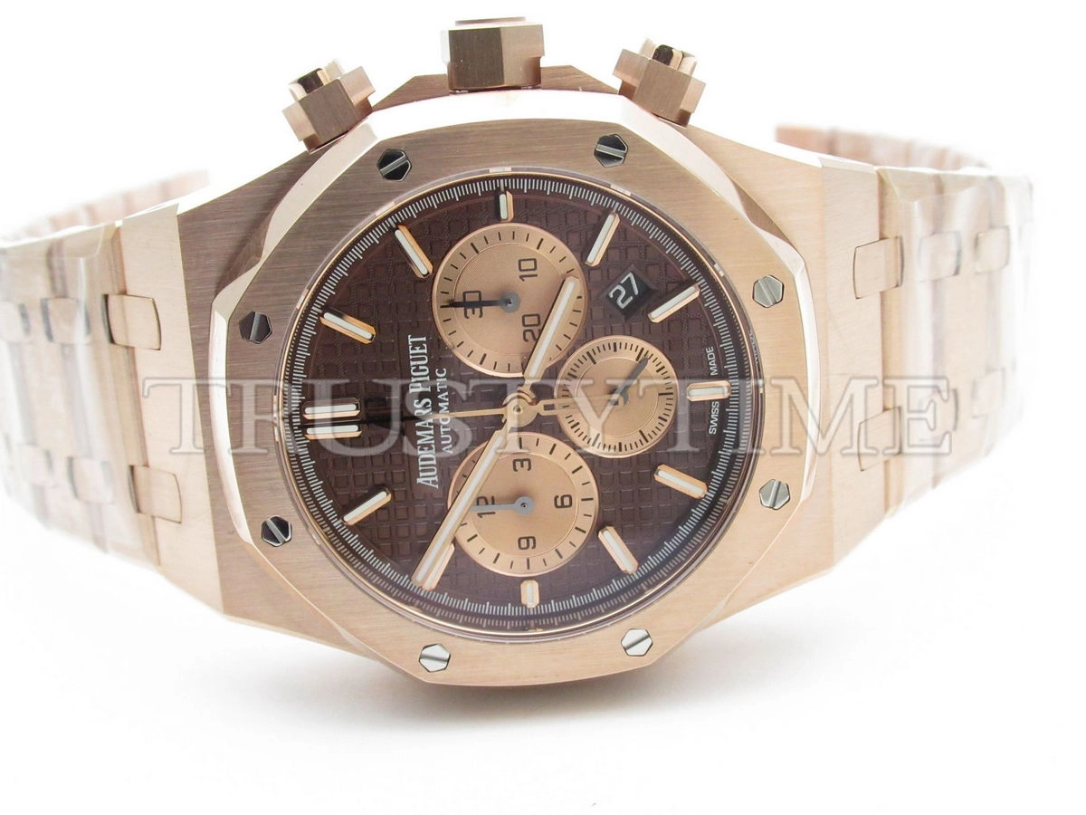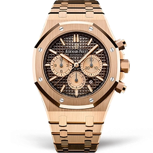 Часы Audemars Piguet из коллекции Royal Oak Chronograph. Спортивные мужские часы Audemars Piguet Royal Oak Chronograph II 26331OR.OO.1220OR.02 премиального качества (Артикул магазина: AP-0778) оснащены надежным автоматическим механизмом с автоподзаводом (работает от амплитуды движения руки) калибра AP2385, в котором реализованы следующие функции: часовая, минутная и секундная стрелки, а так же хронограф, дата. Восьмиугольный корпус часов розового цвета, имеющий размер 41 мм и высоту 15 мм превосходно дополнит образ и украсит запястье своего обладателя. Для изготовления часов Audemars Piguet Royal Oak Chronograph II 26331OR.OO.1220OR.02 предлагаемых в нашем интернет-магазине, применяются нержавеющая сталь 316F высокого качества (Швейцарский стандарт), а так же сапфировое стекло высокой прочности, благодаря чему обеспечивается максимальная защита от сколов и механических повреждений. Отличительной чертой данной модели является коричневый циферблат, часовые индексы которого обеспечивают часовые метки. Завершает образ браслет из нержавеющей стали цвета розового золота с фирменной раскладывающейся застежкой Audemars Piguet. Водонепроницаемость данной модели составляет 30М (WR30) – допускается минимальное воздействие с водой.