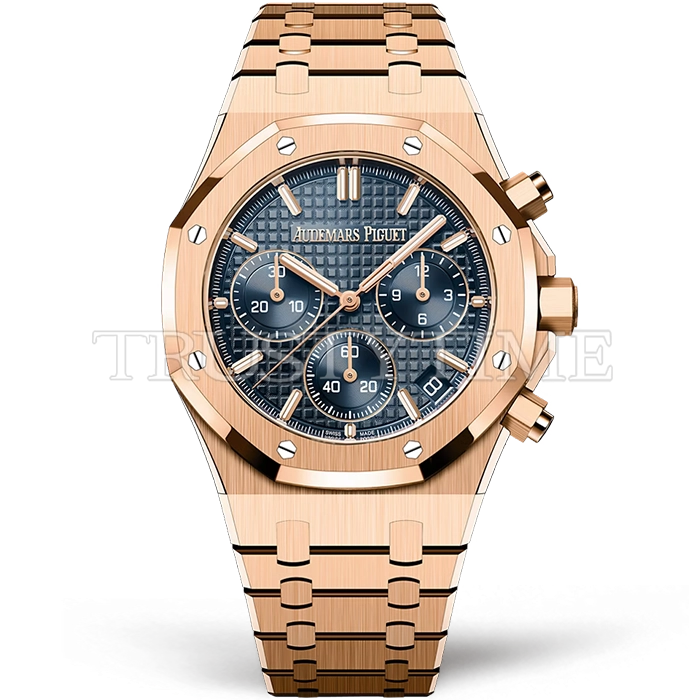 Часы Audemars Piguet из коллекции Royal Oak Chronograph. Спортивные мужские часы Audemars Piguet Royal Oak Selfwinding Chronograph 26240OR.OO.1320OR.05 премиального качества (Артикул магазина: AP-1194) оснащены надежным автоматическим механизмом с автоподзаводом (работает от амплитуды движения руки) калибра AP4401, в котором реализованы следующие функции: часовая, минутная и секундная стрелки, а так же дата, хронограф с функцией flyback (мгновенный перезапуск) в наручных часах (chronograph) — это усложнение, которое позволяет мгновенно сбрасывать показания секундомера одним нажатием кнопки. В обычных хронографах для сброса показаний нужно сначала остановить часы, а затем начать заново. Восьмиугольный корпус часов розового цвета, имеющий размер 41 мм и высоту 12.4 мм превосходно дополнит образ и украсит запястье своего обладателя. Для изготовления часов Audemars Piguet Royal Oak Selfwinding Chronograph 26240OR.OO.1320OR.05 предлагаемых в нашем интернет-магазине, применяются нержавеющая сталь 316F высокого качества (Швейцарский стандарт), а так же сапфировое стекло высокой прочности, благодаря чему обеспечивается максимальная защита от сколов и механических повреждений. Отличительной чертой данной модели является синий циферблат, часовые индексы которого обеспечивают часовые метки. Завершает образ браслет из нержавеющей стали цвета розового золота с фирменной раскладывающейся застежкой Audemars Piguet. Водонепроницаемость данной модели составляет 30М (WR30) – допускается минимальное воздействие с водой.