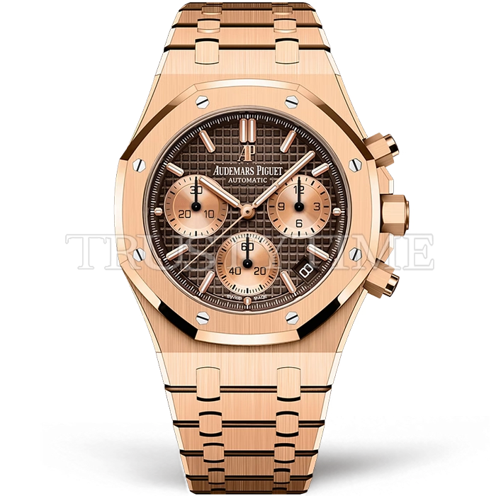 Часы Audemars Piguet из коллекции Royal Oak Chronograph. Спортивные мужские часы Audemars Piguet Royal Oak Selfwinding Chronograph 26239OR.OO.1220OR.02 премиального качества (Артикул магазина: AP-1202) оснащены надежным автоматическим механизмом с автоподзаводом (работает от амплитуды движения руки) калибра AP4401, в котором реализованы следующие функции: часовая, минутная и секундная стрелки, а так же дата, хронограф с функцией flyback (мгновенный перезапуск) в наручных часах (chronograph) — это усложнение, которое позволяет мгновенно сбрасывать показания секундомера одним нажатием кнопки. В обычных хронографах для сброса показаний нужно сначала остановить часы, а затем начать заново. Восьмиугольный корпус часов розового цвета, имеющий размер 41 мм и высоту 12.4 мм превосходно дополнит образ и украсит запястье своего обладателя. Для изготовления часов Audemars Piguet Royal Oak Selfwinding Chronograph 26239OR.OO.1220OR.02 предлагаемых в нашем интернет-магазине, применяются нержавеющая сталь 316F высокого качества (Швейцарский стандарт), а так же сапфировое стекло высокой прочности, благодаря чему обеспечивается максимальная защита от сколов и механических повреждений. Отличительной чертой данной модели является коричневый циферблат, часовые индексы которого обеспечивают часовые метки. Завершает образ браслет из нержавеющей стали цвета розового золота с фирменной раскладывающейся застежкой Audemars Piguet. Водонепроницаемость данной модели составляет 30М (WR30) – допускается минимальное воздействие с водой.