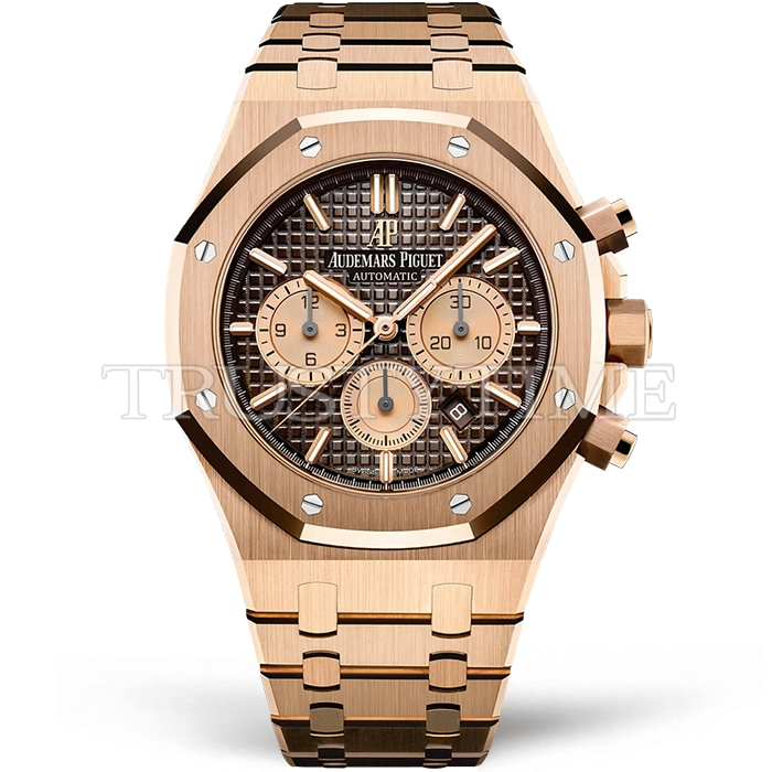 Часы Audemars Piguet из коллекции Royal Oak Chronograph. Спортивные мужские часы Audemars Piguet Royal Oak Selfwinding Chronograph 26331OR.OO.1220OR.02 премиального качества (Артикул магазина: AP-1232) оснащены надежным автоматическим механизмом с автоподзаводом (работает от амплитуды движения руки) калибра AP2385, в котором реализованы следующие функции: часовая, минутная и секундная стрелки, а так же дата, хронограф с функцией flyback (мгновенный перезапуск) в наручных часах (chronograph) — это усложнение, которое позволяет мгновенно сбрасывать показания секундомера одним нажатием кнопки. В обычных хронографах для сброса показаний нужно сначала остановить часы, а затем начать заново. Восьмиугольный корпус часов розового цвета, имеющий размер 41 мм и высоту 11 мм превосходно дополнит образ и украсит запястье своего обладателя. Для изготовления часов Audemars Piguet Royal Oak Selfwinding Chronograph 26331OR.OO.1220OR.02 предлагаемых в нашем интернет-магазине, применяются нержавеющая сталь 316F высокого качества (Швейцарский стандарт), а так же сапфировое стекло высокой прочности, благодаря чему обеспечивается максимальная защита от сколов и механических повреждений. Отличительной чертой данной модели является коричневый циферблат, часовые индексы которого обеспечивают часовые метки. Завершает образ браслет из нержавеющей стали цвета розового золота с фирменной раскладывающейся застежкой Audemars Piguet. Водонепроницаемость данной модели составляет 30М (WR30) – допускается минимальное воздействие с водой.