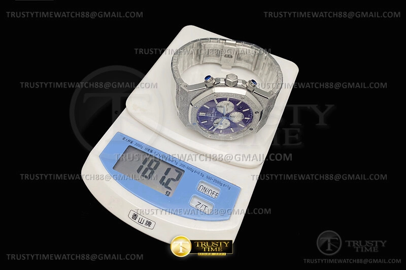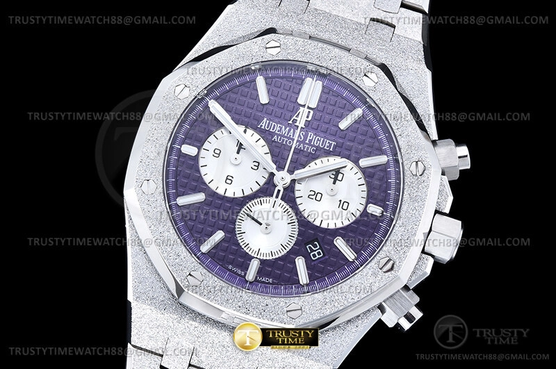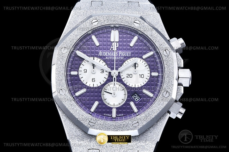 Часы Audemars Piguet из коллекции Royal Oak Chronograph. Спортивные мужские часы Audemars Piguet Royal Oak Frosted Gold Selfwinding Chronograph 26331BC.GG.1224BC.01 премиального качества (Артикул магазина: AP-1238) оснащены надежным автоматическим механизмом с автоподзаводом (работает от амплитуды движения руки) калибра AP2385, в котором реализованы следующие функции: часовая, минутная и секундная стрелки, а так же дата, хронограф с функцией flyback (мгновенный перезапуск) в наручных часах (chronograph) — это усложнение, которое позволяет мгновенно сбрасывать показания секундомера одним нажатием кнопки. В обычных хронографах для сброса показаний нужно сначала остановить часы, а затем начать заново. Восьмиугольный корпус часов розового цвета, имеющий размер 41 мм и высоту 11 мм превосходно дополнит образ и украсит запястье своего обладателя. Для изготовления часов Audemars Piguet Royal Oak Frosted Gold Selfwinding Chronograph 26331BC.GG.1224BC.01 предлагаемых в нашем интернет-магазине, применяются каменистая сталь 316F высокого качества (Швейцарский стандарт), а так же сапфировое стекло высокой прочности, благодаря чему обеспечивается максимальная защита от сколов и механических повреждений. Отличительной чертой данной модели является фиолетовый циферблат, часовые индексы которого обеспечивают часовые метки. Завершает образ браслет из нержавеющей стали каменистой фактуры стального цвета с фирменной раскладывающейся застежкой Audemars Piguet. Водонепроницаемость данной модели составляет 30М (WR30) – допускается минимальное воздействие с водой.