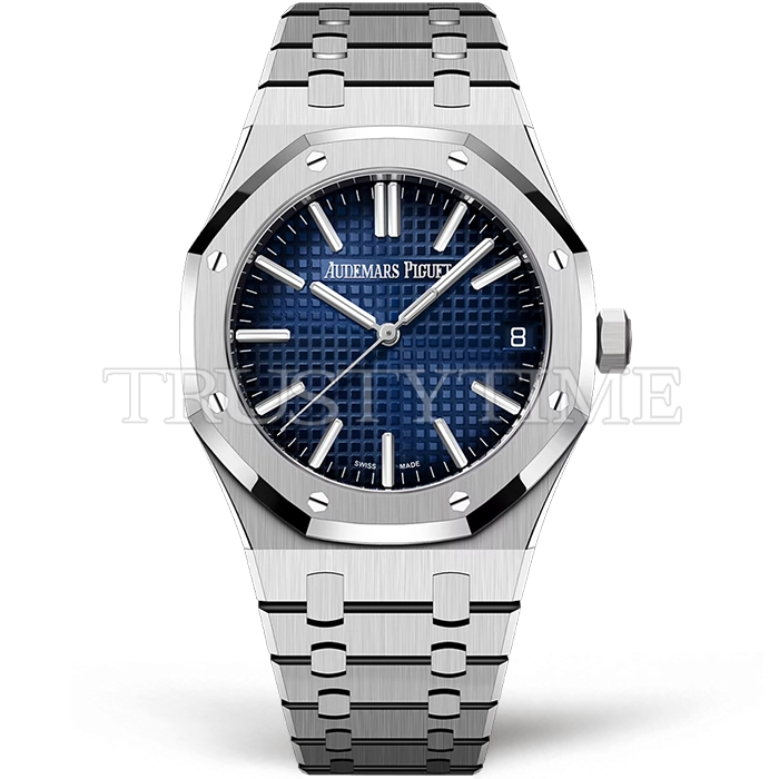 Часы Audemars Piguet из коллекции Royal Oak. Классические мужские часы Audemars Piguet Royal Oak Selfwinding Special Edition 15510BC.OO.1320BC.04 премиального качества (Артикул магазина: AP-1222) оснащены надежным автоматическим механизмом с автоподзаводом (работает от амплитуды движения руки) калибра AP4302, в котором реализованы следующие функции: часовая, минутная и секундная стрелки, а так же дата. Восьмиугольный корпус часов стального цвета, имеющий размер 41 мм и высоту 10.5 мм превосходно дополнит образ и украсит запястье своего обладателя. Для изготовления часов Audemars Piguet Royal Oak Selfwinding Special Edition 15510BC.OO.1320BC.04 предлагаемых в нашем интернет-магазине, применяются нержавеющая сталь 316F высокого качества (Швейцарский стандарт), а так же сапфировое стекло высокой прочности, благодаря чему обеспечивается максимальная защита от сколов и механических повреждений. Отличительной чертой данной модели является синий циферблат, часовые индексы которого обеспечивают часовые метки. Завершает образ браслет из нержавеющей стали стального цвета с фирменной раскладывающейся застежкой Audemars Piguet. Водонепроницаемость данной модели составляет 30М (WR30) – допускается минимальное воздействие с водой.