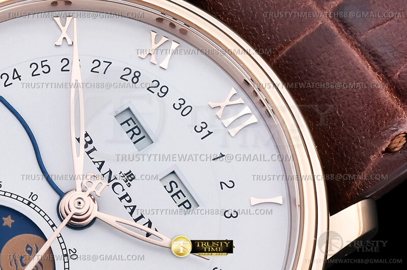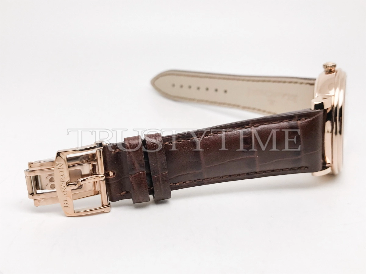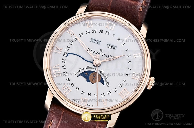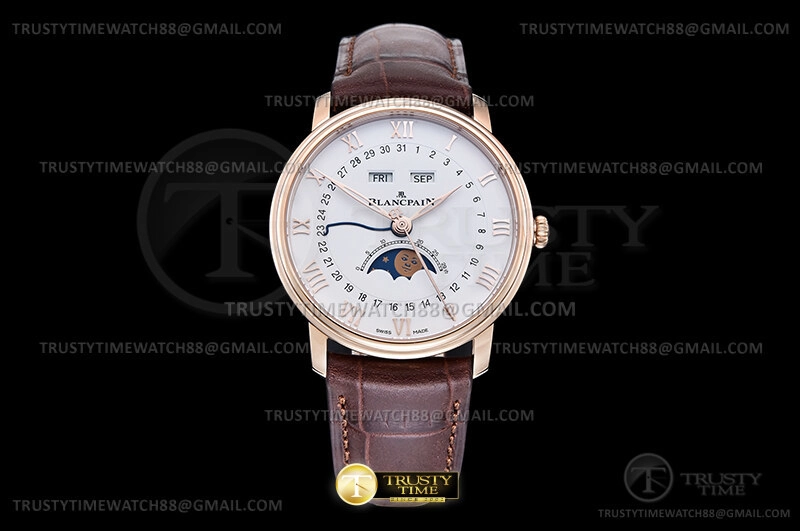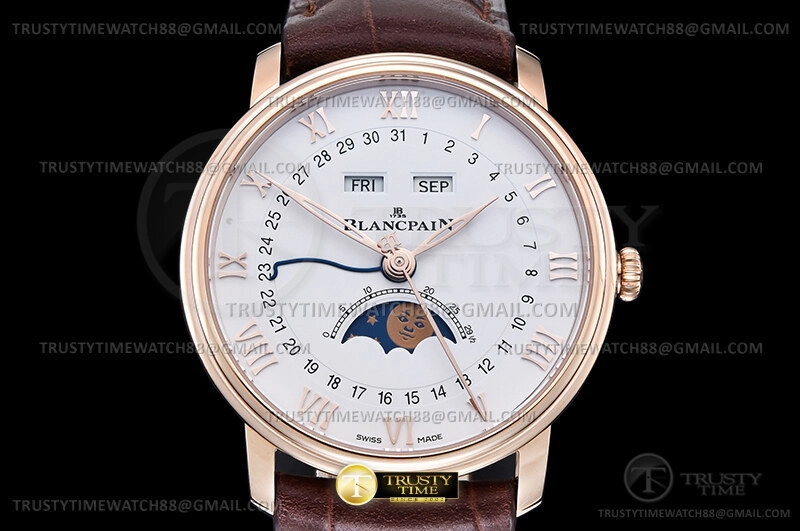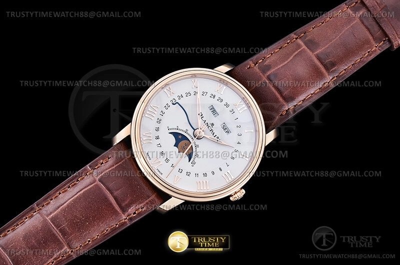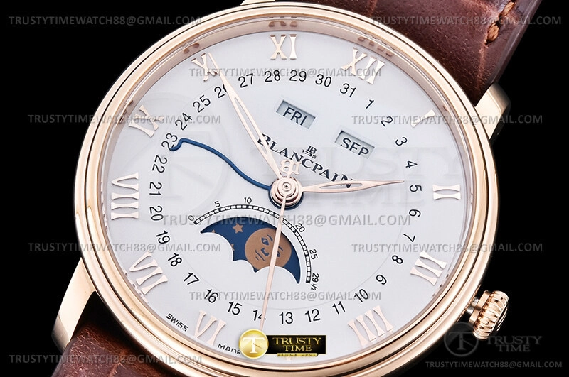 Часы Blancpain из коллекции Villeret Complications. Классические мужские часы Blancpain Villeret Moonphase 6654-3642-55B премиального качества (Артикул магазина: BP-0359) оснащены надежным автоматическим механизмом с автоподзаводом (работает от амплитуды движения руки) калибра BP6654, в котором реализованы следующие функции: часовая, минутная и секундная стрелки, а так же дата, фаза луны, день недели, месяц. Круглый корпус часов розового цвета, имеющий размер 40 мм и высоту 12 мм превосходно дополнит образ и украсит запястье своего обладателя. Для изготовления часов Blancpain Villeret Moonphase 6654-3642-55B предлагаемых в нашем интернет-магазине, применяются нержавеющая сталь 316L высокого качества (Швейцарский стандарт), а так же сапфировое стекло высокой прочности, благодаря чему обеспечивается максимальная защита от сколов и механических повреждений. Отличительной чертой данной модели является белый циферблат, часовые индексы которого обеспечивают римские цифры. Завершает образ кожаный ремешок коричневого цвета с фирменной раскладывающейся застежкой Blancpain. Водонепроницаемость данной модели составляет 30М (WR30) – допускается минимальное воздействие с водой.