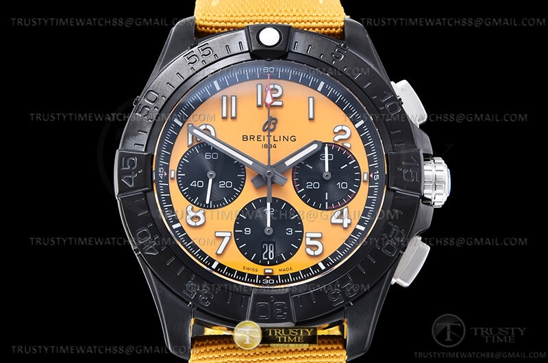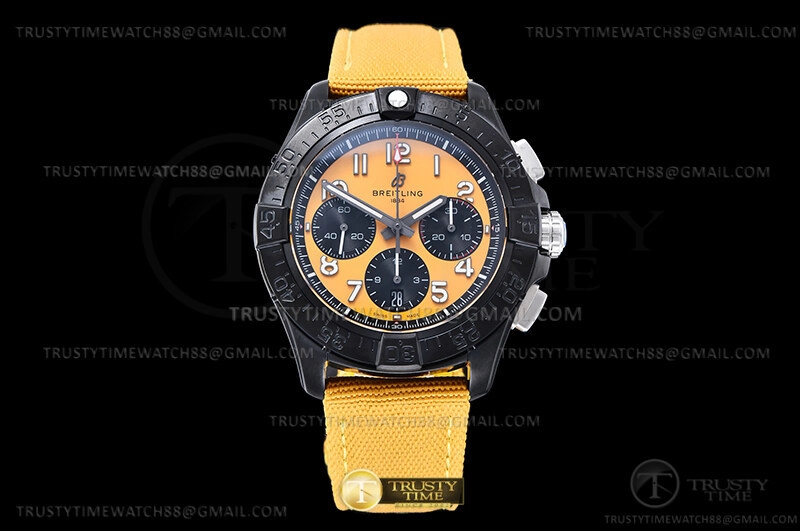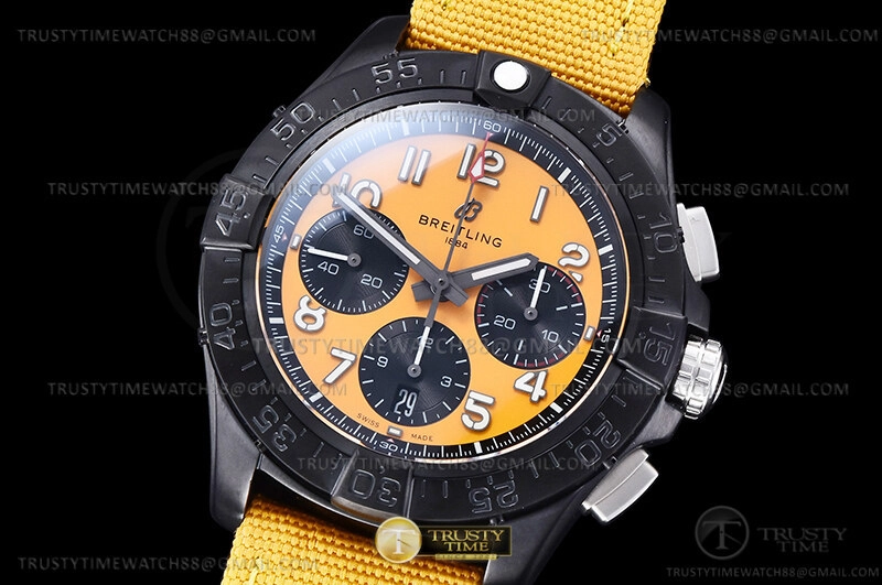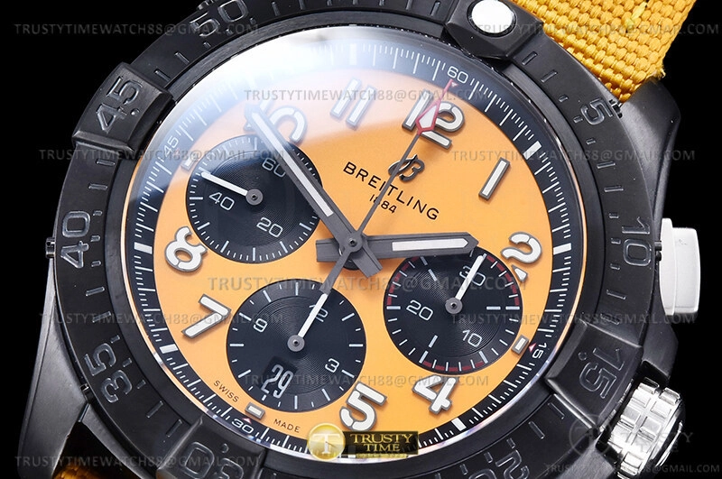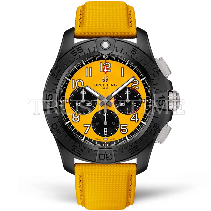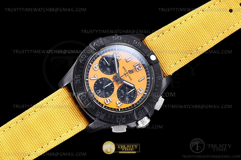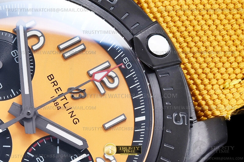Часы Breitling из коллекции Avenger B01 Chronograph. Спортивные мужские часы Breitling Aneger B01 Chronograph 44 Night Mission SB0147101I1X1 премиального качества (Артикул магазина: BT-1158) оснащены надежным автоматическим механизмом с автоподзаводом (работает от амплитуды движения руки) калибра Valjoux-7750, в котором реализованы следующие функции: часовая, минутная и секундная стрелки, а так же хронограф, дата. Круглый корпус часов черного цвета, имеющий размер 44 мм и высоту 17 мм превосходно дополнит образ и украсит запястье своего обладателя. Для изготовления часов Breitling Aneger B01 Chronograph 44 Night Mission SB0147101I1X1 предлагаемых в нашем интернет-магазине, применяются нержавеющая сталь 316F высокого качества (Швейцарский стандарт), а так же сапфировое стекло высокой прочности, благодаря чему обеспечивается максимальная защита от сколов и механических повреждений. Отличительной чертой данной модели является желтый циферблат, часовые индексы которого обеспечивают арабские цифры. Завершает образ нейлоновый ремешок желтого цвета с фирменной раскладывающейся застежкой Breitling. Водонепроницаемость данной модели составляет 30М (WR30) – допускается минимальное воздействие с водой.