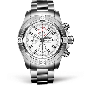 Часы Breitling из коллекции Super Avenger. Спортивные мужские часы Breitling Super Avenger Chronograph 48 A133751A1A1A1 премиального качества (Артикул магазина: BT-0256) оснащены надежным автоматическим механизмом с автоподзаводом (работает от амплитуды движения руки) калибра Valjoux-7750, в котором реализованы следующие функции: часовая, минутная и секундная стрелки, а так же хронограф, дата. Круглый корпус часов стального цвета, имеющий размер 48.4 мм и высоту 18.6 мм превосходно дополнит образ и украсит запястье своего обладателя. Для изготовления часов Breitling Super Avenger Chronograph 48 A133751A1A1A1 предлагаемых в нашем интернет-магазине, применяются нержавеющая сталь 316L высокого качества (Швейцарский стандарт), а так же сапфировое стекло высокой прочности, благодаря чему обеспечивается максимальная защита от сколов и механических повреждений. Отличительной чертой данной модели является белый циферблат, часовые индексы которого обеспечивают часовые метки. Завершает образ браслет из нержавеющей стали стального цвета с фирменной раскладывающейся застежкой Breitling. Водонепроницаемость данной модели составляет 30М (WR30) – допускается минимальное воздействие с водой.