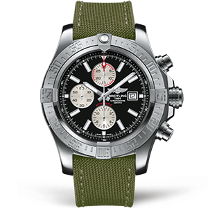 Часы Breitling из коллекции Super Avenger. Спортивные мужские часы Breitling Aeromarine Super Avenger II 48 A1337111/BC29/105W/A20BA.1 премиального качества (Артикул магазина: BT-0668) оснащены надежным автоматическим механизмом с автоподзаводом (работает от амплитуды движения руки) калибра Valjoux-7750, в котором реализованы следующие функции: часовая, минутная и секундная стрелки, а так же хронограф, дата. Круглый корпус часов стального цвета, имеющий размер 48.4 мм и высоту 18.6 мм превосходно дополнит образ и украсит запястье своего обладателя. Для изготовления часов Breitling Aeromarine Super Avenger II 48 A1337111/BC29/105W/A20BA.1 предлагаемых в нашем интернет-магазине, применяются нержавеющая сталь 316L высокого качества (Швейцарский стандарт), а так же сапфировое стекло высокой прочности, благодаря чему обеспечивается максимальная защита от сколов и механических повреждений. Отличительной чертой данной модели является черный циферблат, часовые индексы которого обеспечивают часовые метки. Завершает образ нейлоновый ремешок зеленого цвета с фирменной классической застежкой Breitling. Водонепроницаемость данной модели составляет 30М (WR30) – допускается минимальное воздействие с водой.
