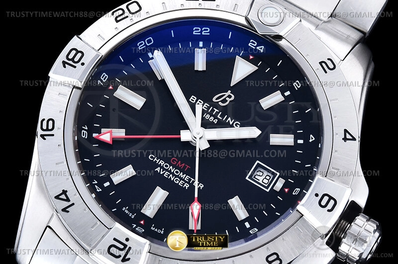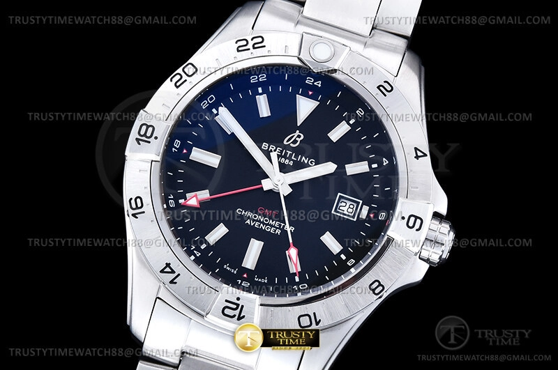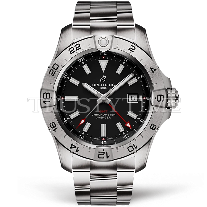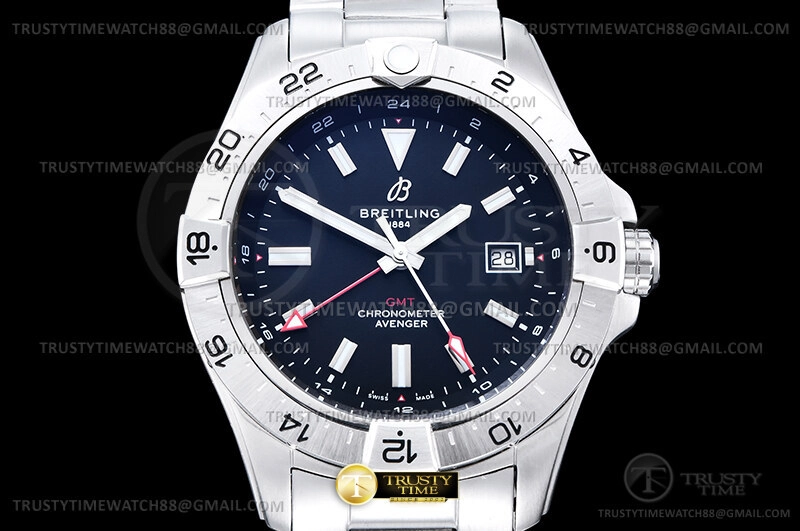 Часы Breitling из коллекции Avenger GMT. Спортивные мужские часы Breitling Aneger Automatic GMT 44 A32320101B1A1 премиального качества (Артикул магазина: BT-1169) оснащены надежным автоматическим механизмом с автоподзаводом (работает от амплитуды движения руки) калибра ETA2836-2, в котором реализованы следующие функции: часовая, минутная и секундная стрелки, а так же дата, двойное время (GMT). Круглый корпус часов стального цвета, имеющий размер 44 мм и высоту 13 мм превосходно дополнит образ и украсит запястье своего обладателя. Для изготовления часов Breitling Aneger Automatic GMT 44 A32320101B1A1 предлагаемых в нашем интернет-магазине, применяются нержавеющая сталь 316L высокого качества (Швейцарский стандарт), а так же сапфировое стекло высокой прочности, благодаря чему обеспечивается максимальная защита от сколов и механических повреждений. Отличительной чертой данной модели является черный циферблат, часовые индексы которого обеспечивают часовые метки. Завершает образ браслет из нержавеющей стали стального цвета с фирменной раскладывающейся застежкой Breitling. Водонепроницаемость данной модели составляет 30М (WR30) – допускается минимальное воздействие с водой.