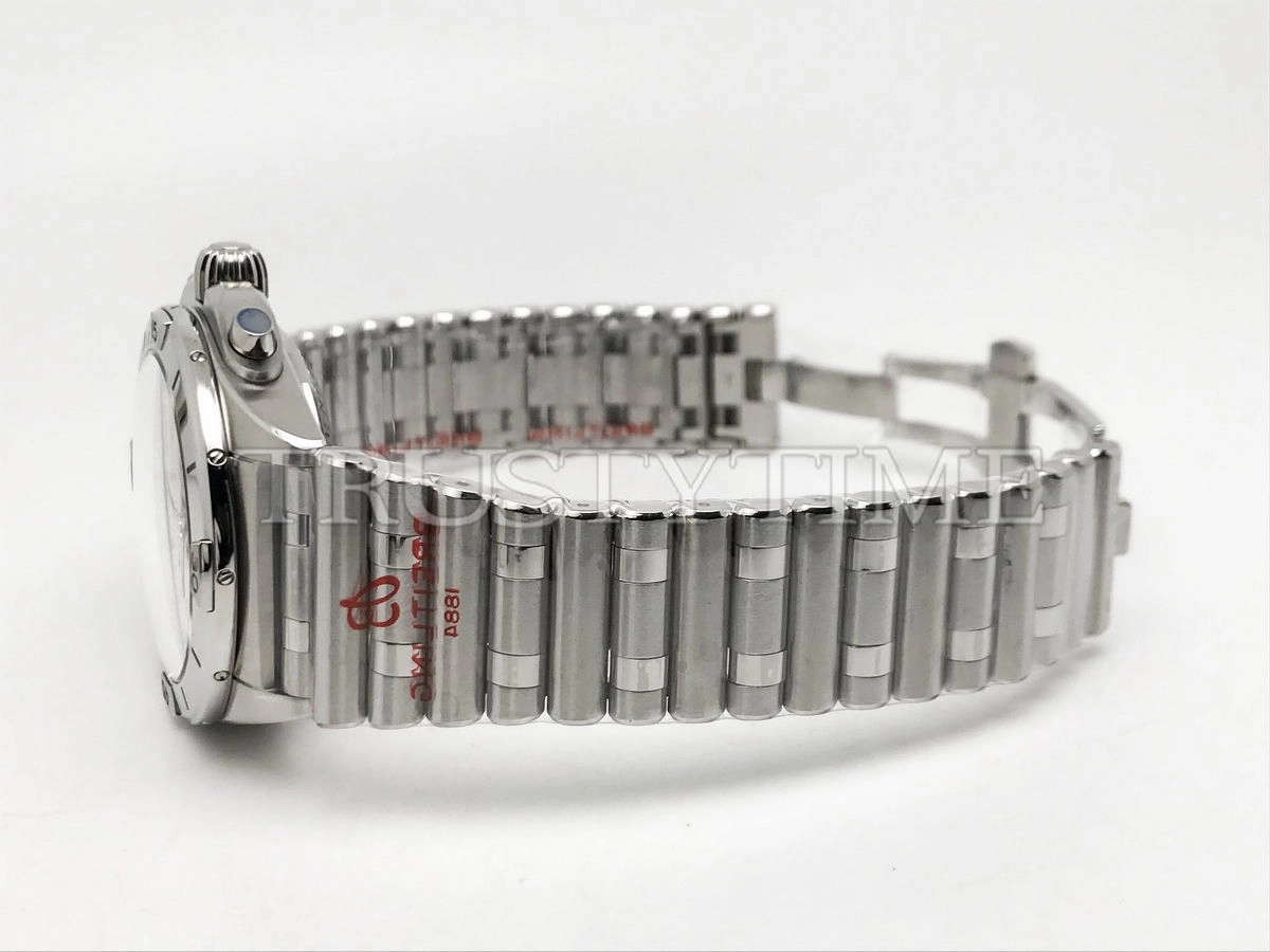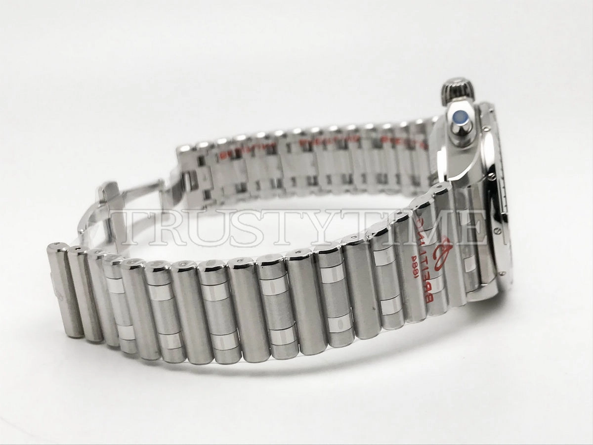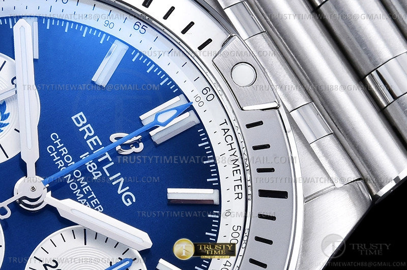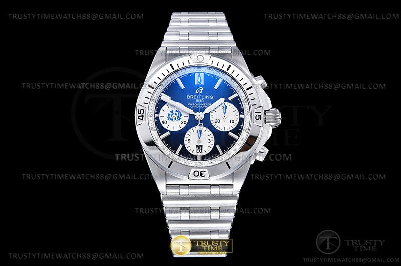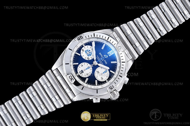 Часы Breitling из коллекции Chronomat B01. Спортивные мужские часы Breitling Chronomat B01 42 Six Nations Scotland AB0134A51C1A1 премиального качества (Артикул магазина: BT-1097) оснащены надежным автоматическим механизмом с автоподзаводом (работает от амплитуды движения руки) калибра Valjoux-7750, в котором реализованы следующие функции: часовая, минутная и секундная стрелки, а так же хронограф, дата. Круглый корпус часов стального цвета, имеющий размер 42 мм и высоту 16.5 мм превосходно дополнит образ и украсит запястье своего обладателя. Для изготовления часов Breitling Chronomat B01 42 Six Nations Scotland AB0134A51C1A1 предлагаемых в нашем интернет-магазине, применяются нержавеющая сталь 316F высокого качества (Швейцарский стандарт), а так же сапфировое стекло высокой прочности, благодаря чему обеспечивается максимальная защита от сколов и механических повреждений. Отличительной чертой данной модели является синий циферблат, часовые индексы которого обеспечивают часовые метки. Завершает образ браслет из нержавеющей стали стального цвета с фирменной раскладывающейся застежкой Breitling. Водонепроницаемость данной модели составляет 30М (WR30) – допускается минимальное воздействие с водой.