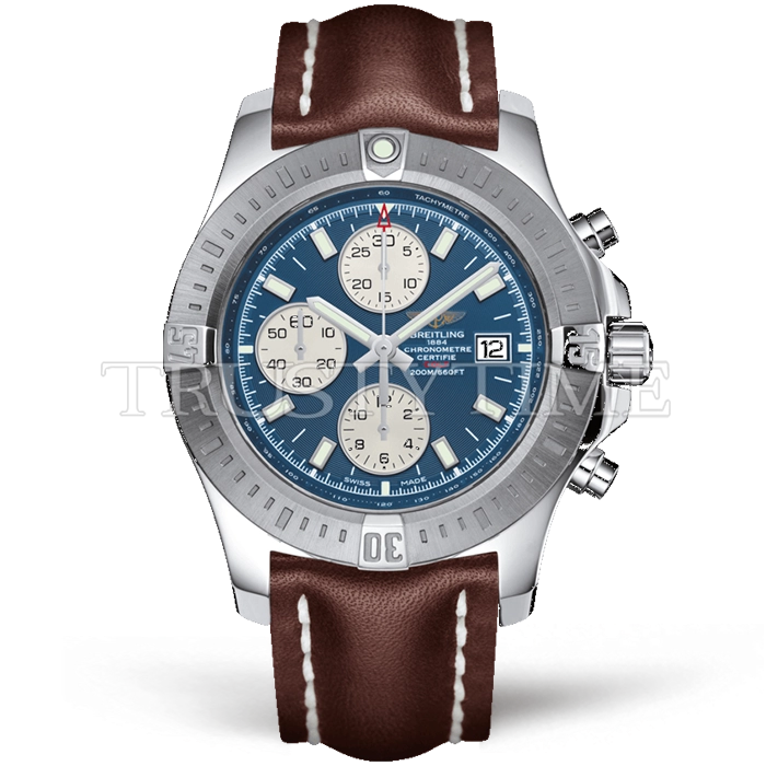Часы Breitling из коллекции Colt Chronograph. Спортивные мужские часы Breitling Colt Chronograph Automatic 44 A1338811/C914/437X/A20BA.1 премиального качества (Артикул магазина: BT-0874) оснащены надежным автоматическим механизмом с автоподзаводом (работает от амплитуды движения руки) калибра Valjoux-7750, в котором реализованы следующие функции: часовая, минутная и секундная стрелки, а так же хронограф, дата. Круглый корпус часов стального цвета, имеющий размер 44 мм и высоту 15 мм превосходно дополнит образ и украсит запястье своего обладателя. Для изготовления часов Breitling Colt Chronograph Automatic 44 A1338811/C914/437X/A20BA.1 предлагаемых в нашем интернет-магазине, применяются нержавеющая сталь 316L высокого качества (Швейцарский стандарт), а так же сапфировое стекло высокой прочности, благодаря чему обеспечивается максимальная защита от сколов и механических повреждений. Отличительной чертой данной модели является синий циферблат, часовые индексы которого обеспечивают часовые метки. Завершает образ кожаный ремешок коричневого цвета с фирменной классической застежкой Breitling. Водонепроницаемость данной модели составляет 30М (WR30) – допускается минимальное воздействие с водой.