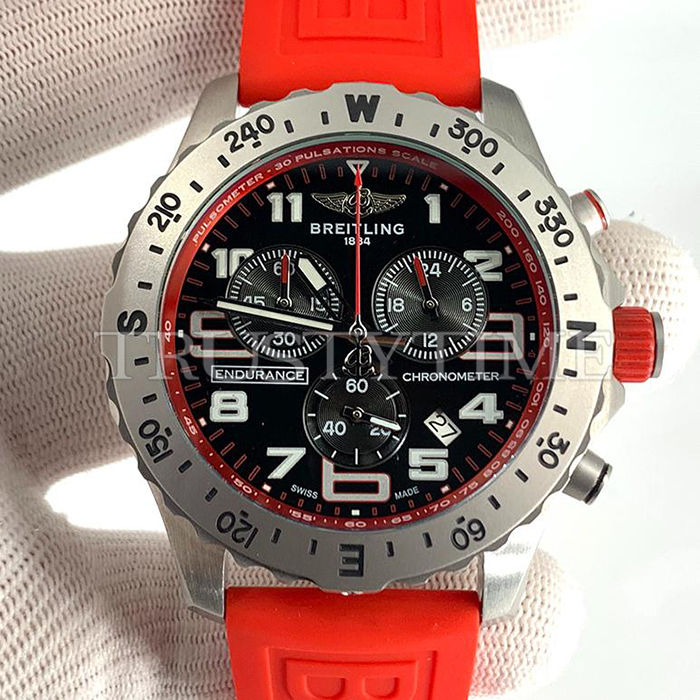 Часы Breitling из коллекции Endurance Pro. Спортивные мужские часы Breitling Endurance Pro качества ААА+ (Артикул магазина: BT-0056) оснащены надежным кварцевым механизмом (работает от батареи) калибра Quartz ETA 256.031, в котором реализованы следующие функции: часовая, минутная и секундная стрелки, а так же хронограф, дата. Круглый корпус часов стального цвета, имеющий размер 46 мм и высоту 16 мм превосходно дополнит образ и украсит запястье своего обладателя. Для изготовления часов Breitling Endurance Pro предлагаемых в нашем интернет-магазине, применяются нержавеющая сталь 316L высокого качества (Швейцарский стандарт), а так же сапфировое стекло высокой прочности, благодаря чему обеспечивается максимальная защита от сколов и механических повреждений. Отличительной чертой данной модели является черный циферблат, часовые индексы которого обеспечивают арабские цифры. Завершает образ каучуковый ремешок красного цвета с фирменной классической застежкой Breitling. Водонепроницаемость данной модели составляет 30М (WR30) – допускается минимальное воздействие с водой.