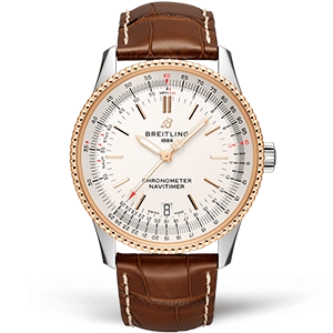 Часы Breitling из коллекции Navitimer. Классические мужские часы Breitling Navitimer Automatic 38 U17325211G1P1 премиального качества (Артикул магазина: BT-0896) оснащены надежным автоматическим механизмом с автоподзаводом (работает от амплитуды движения руки) калибра ETA2824-2, в котором реализованы следующие функции: часовая, минутная и секундная стрелки, а так же дата. Круглый корпус часов комбинированного сталь с розового золота цвета, имеющий размер 38 мм и высоту 10 мм превосходно дополнит образ и украсит запястье своего обладателя. Для изготовления часов Breitling Navitimer Automatic 38 U17325211G1P1 предлагаемых в нашем интернет-магазине, применяются нержавеющая сталь 316L высокого качества (Швейцарский стандарт), а так же сапфировое стекло высокой прочности, благодаря чему обеспечивается максимальная защита от сколов и механических повреждений. Отличительной чертой данной модели является белый циферблат, часовые индексы которого обеспечивают часовые метки. Завершает образ кожаный ремешок коричневого цвета с фирменной классической застежкой Breitling. Водонепроницаемость данной модели составляет 30М (WR30) – допускается минимальное воздействие с водой.