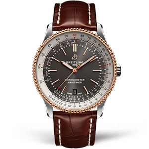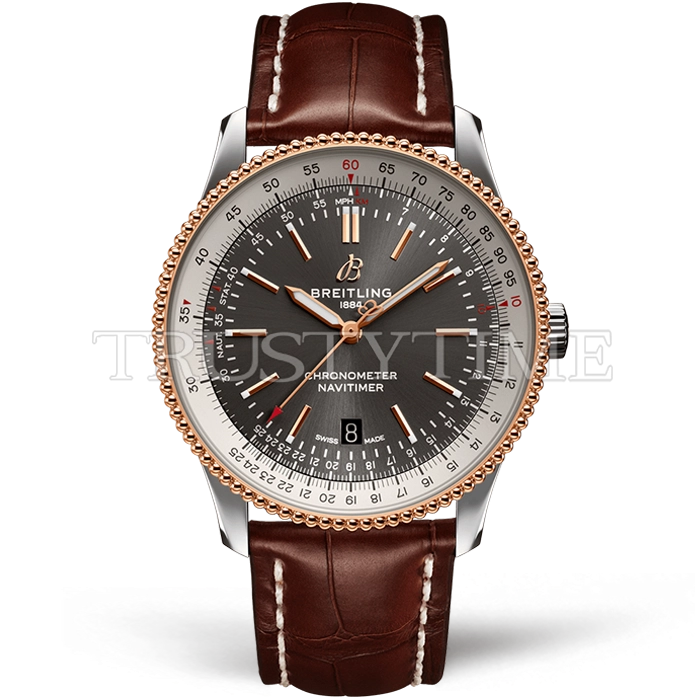 Часы Breitling из коллекции Navitimer. Классические мужские часы Breitling Navitimer Automatic 41 U17326211M1P2 премиального качества (Артикул магазина: BT-0905) оснащены надежным автоматическим механизмом с автоподзаводом (работает от амплитуды движения руки) калибра ETA2824-2, в котором реализованы следующие функции: часовая, минутная и секундная стрелки, а так же дата. Круглый корпус часов комбинированного сталь с розового золота цвета, имеющий размер 41 мм и высоту 10 мм превосходно дополнит образ и украсит запястье своего обладателя. Для изготовления часов Breitling Navitimer Automatic 41 U17326211M1P2 предлагаемых в нашем интернет-магазине, применяются нержавеющая сталь 316L высокого качества (Швейцарский стандарт), а так же сапфировое стекло высокой прочности, благодаря чему обеспечивается максимальная защита от сколов и механических повреждений. Отличительной чертой данной модели является серый циферблат, часовые индексы которого обеспечивают часовые метки. Завершает образ кожаный ремешок коричневого цвета с фирменной раскладывающейся застежкой Breitling. Водонепроницаемость данной модели составляет 30М (WR30) – допускается минимальное воздействие с водой.