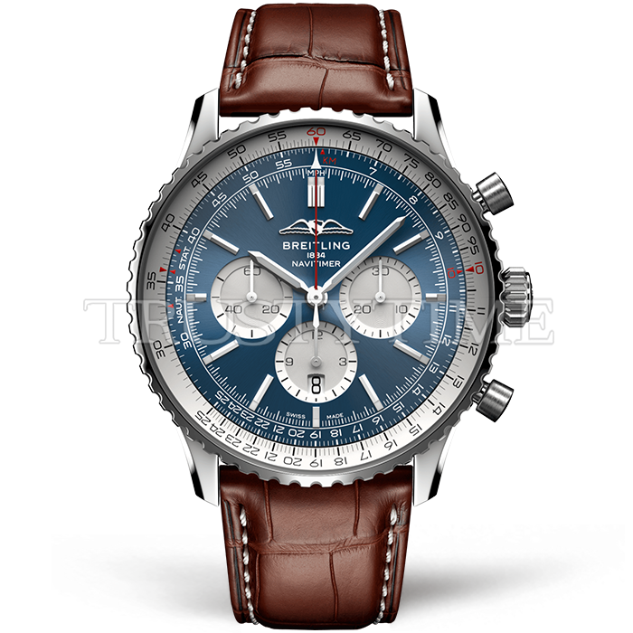 Часы Breitling из коллекции Navitimer B01. Спортивные мужские часы Breitling Navitimer B01 Chronograph 46 AB0137211C1P1 премиального качества (Артикул магазина: BT-1076) оснащены надежным автоматическим механизмом с автоподзаводом (работает от амплитуды движения руки) калибра Valjoux-7750, в котором реализованы следующие функции: часовая, минутная и секундная стрелки, а так же хронограф, дата. Круглый корпус часов стального цвета, имеющий размер 46 мм и высоту 15 мм превосходно дополнит образ и украсит запястье своего обладателя. Для изготовления часов Breitling Navitimer B01 Chronograph 46 AB0137211C1P1 предлагаемых в нашем интернет-магазине, применяются нержавеющая сталь 316L высокого качества (Швейцарский стандарт), а так же сапфировое стекло высокой прочности, благодаря чему обеспечивается максимальная защита от сколов и механических повреждений. Отличительной чертой данной модели является синий циферблат, часовые индексы которого обеспечивают часовые метки. Завершает образ кожаный ремешок коричневого цвета с фирменной классической застежкой Breitling. Водонепроницаемость данной модели составляет 30М (WR30) – допускается минимальное воздействие с водой.