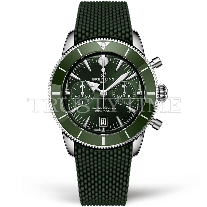 Часы Breitling из коллекции Superocean Heritage B01 Chronograph. Спортивные мужские часы Breitling Superocean Heritage B01 Chronograph 42 AB0156361L1S1 премиального качества (Артикул магазина: BT-1180) оснащены надежным автоматическим механизмом с автоподзаводом (работает от амплитуды движения руки) калибра Valjoux-7750, в котором реализованы следующие функции: часовая, минутная и секундная стрелки, а так же хронограф, дата. Круглый корпус часов стального цвета, имеющий размер 42 мм и высоту 18.5 мм превосходно дополнит образ и украсит запястье своего обладателя. Для изготовления часов Breitling Superocean Heritage B01 Chronograph 42 AB0156361L1S1 предлагаемых в нашем интернет-магазине, применяются нержавеющая сталь 316F высокого качества (Швейцарский стандарт), а так же сапфировое стекло высокой прочности, благодаря чему обеспечивается максимальная защита от сколов и механических повреждений. Отличительной чертой данной модели является зеленый циферблат, часовые индексы которого обеспечивают часовые метки. Завершает образ каучуковый ремешок зеленого цвета с фирменной раскладывающейся застежкой Breitling. Водонепроницаемость данной модели составляет 30М (WR30) – допускается минимальное воздействие с водой.