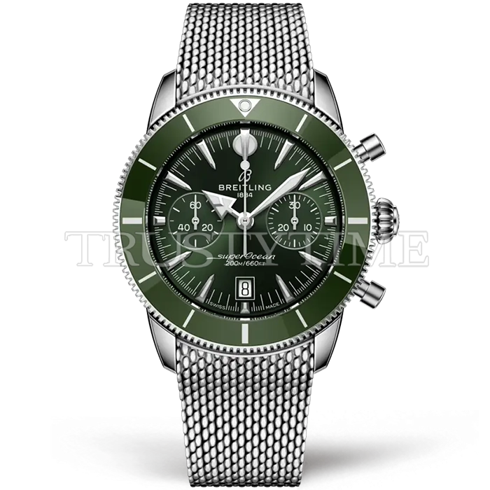 Часы Breitling из коллекции Superocean Heritage B01 Chronograph. Спортивные мужские часы Breitling Superocean Heritage B01 Chronograph 42 AB0156361L1A1 премиального качества (Артикул магазина: BT-1187) оснащены надежным автоматическим механизмом с автоподзаводом (работает от амплитуды движения руки) калибра Valjoux-7750, в котором реализованы следующие функции: часовая, минутная и секундная стрелки, а так же хронограф, дата. Круглый корпус часов стального цвета, имеющий размер 42 мм и высоту 18.5 мм превосходно дополнит образ и украсит запястье своего обладателя. Для изготовления часов Breitling Superocean Heritage B01 Chronograph 42 AB0156361L1A1 предлагаемых в нашем интернет-магазине, применяются нержавеющая сталь 316F высокого качества (Швейцарский стандарт), а так же сапфировое стекло высокой прочности, благодаря чему обеспечивается максимальная защита от сколов и механических повреждений. Отличительной чертой данной модели является зеленый циферблат, часовые индексы которого обеспечивают часовые метки. Завершает образ браслет из нержавеющей стали стального цвета с фирменной раскладывающейся застежкой Breitling. Водонепроницаемость данной модели составляет 30М (WR30) – допускается минимальное воздействие с водой.