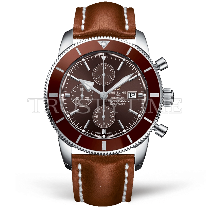 Часы Breitling из коллекции Superocean Heritage II Chronograph. Спортивные мужские часы Breitling Superocean Heritage Chronograph 46 A1331233/Q616/440X/A20D.1 премиального качества (Артикул магазина: BT-0971) оснащены надежным автоматическим механизмом с автоподзаводом (работает от амплитуды движения руки) калибра Valjoux-7750, в котором реализованы следующие функции: часовая, минутная и секундная стрелки, а так же хронограф, дата. Круглый корпус часов стального цвета, имеющий размер 46 мм и высоту 16.4 мм превосходно дополнит образ и украсит запястье своего обладателя. Для изготовления часов Breitling Superocean Heritage Chronograph 46 A1331233/Q616/440X/A20D.1 предлагаемых в нашем интернет-магазине, применяются нержавеющая сталь 316L высокого качества (Швейцарский стандарт), а так же сапфировое стекло высокой прочности, благодаря чему обеспечивается максимальная защита от сколов и механических повреждений. Отличительной чертой данной модели является коричневый циферблат, часовые индексы которого обеспечивают часовые метки. Завершает образ кожаный ремешок коричневого цвета с фирменной раскладывающейся застежкой Breitling. Водонепроницаемость данной модели составляет 30М (WR30) – допускается минимальное воздействие с водой.