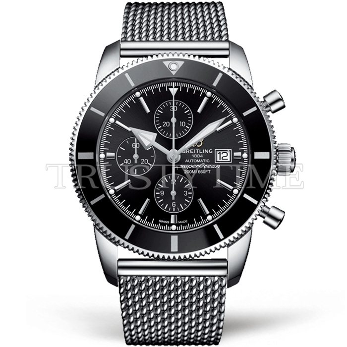 Часы Breitling из коллекции Superocean Heritage II Chronograph. Спортивные мужские часы Breitling Superocean Heritage II Chronograph Volcano 46 A1331212/BF78/152A премиального качества (Артикул магазина: BT-1008) оснащены надежным автоматическим механизмом с автоподзаводом (работает от амплитуды движения руки) калибра Valjoux-7750, в котором реализованы следующие функции: часовая, минутная и секундная стрелки, а так же хронограф, дата. Круглый корпус часов стального цвета, имеющий размер 46 мм и высоту 17 мм превосходно дополнит образ и украсит запястье своего обладателя. Для изготовления часов Breitling Superocean Heritage II Chronograph Volcano 46 A1331212/BF78/152A предлагаемых в нашем интернет-магазине, применяются нержавеющая сталь 316F высокого качества (Швейцарский стандарт), а так же сапфировое стекло высокой прочности, благодаря чему обеспечивается максимальная защита от сколов и механических повреждений. Отличительной чертой данной модели является черный циферблат, часовые индексы которого обеспечивают часовые метки. Завершает образ браслет из нержавеющей стали стального цвета с фирменной раскладывающейся застежкой Breitling. Водонепроницаемость данной модели составляет 30М (WR30) – допускается минимальное воздействие с водой.