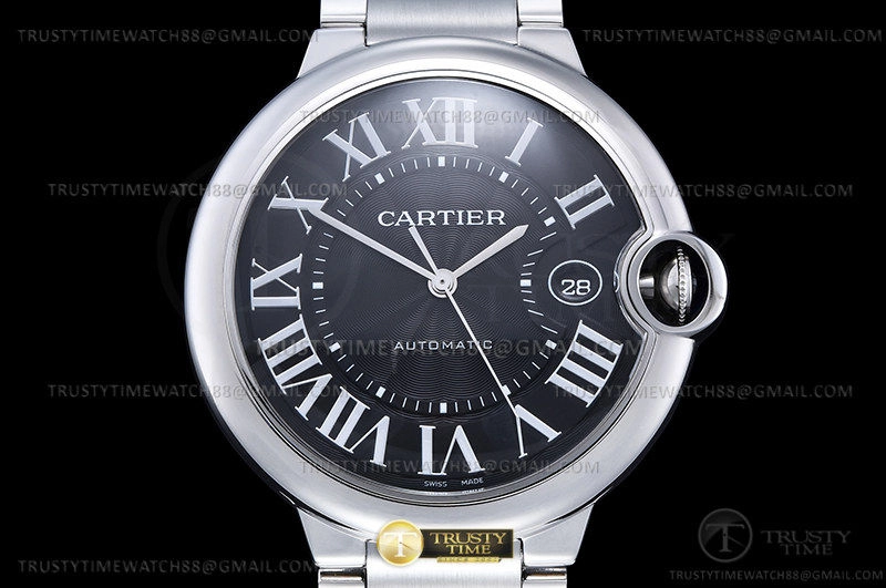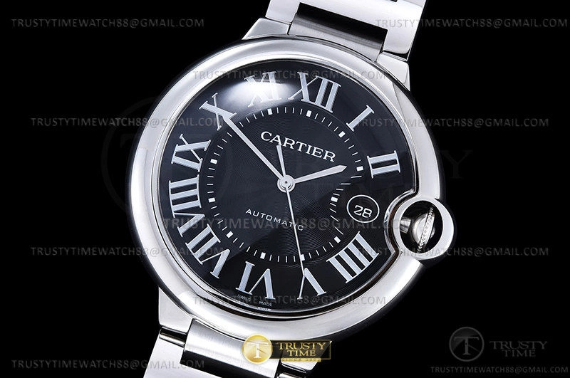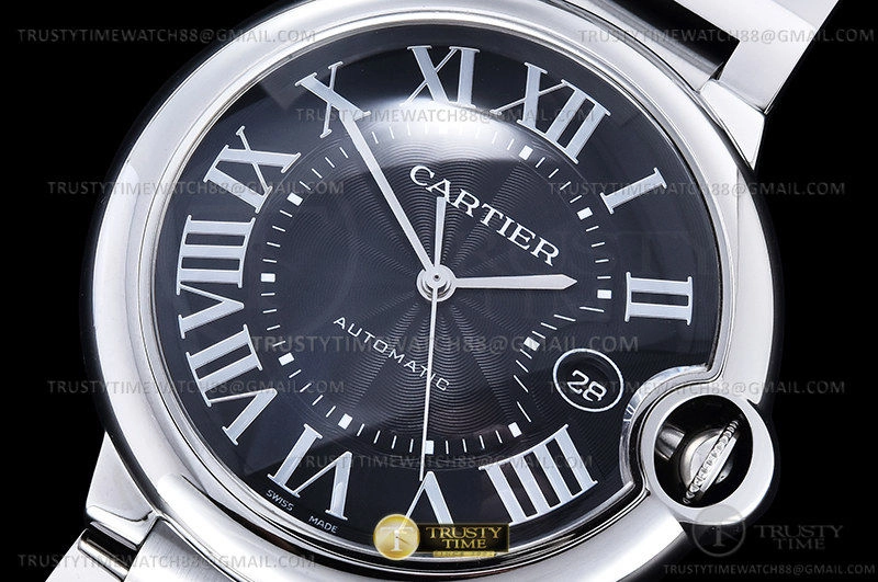Часы Cartier из коллекции Ballon Bleu De Cartier. Классические мужские часы Cartier Ballon Bleu 42 W6920042 премиального качества (Артикул магазина: CR-0431) оснащены надежным автоматическим механизмом с автоподзаводом (работает от амплитуды движения руки) калибра Seiko NH05A, в котором реализованы следующие функции: часовая, минутная и секундная стрелки, а так же дата. Круглый корпус часов стального цвета, имеющий размер 42 мм и высоту 13 мм превосходно дополнит образ и украсит запястье своего обладателя. Для изготовления часов Cartier Ballon Bleu 42 W6920042 предлагаемых в нашем интернет-магазине, применяются нержавеющая сталь 316L высокого качества (Швейцарский стандарт), а так же сапфировое стекло высокой прочности, благодаря чему обеспечивается максимальная защита от сколов и механических повреждений. Отличительной чертой данной модели является черный циферблат, часовые индексы которого обеспечивают римские цифры. Завершает образ браслет из нержавеющей стали стального цвета с фирменной раскладывающейся застежкой Cartier. Водонепроницаемость данной модели составляет 30М (WR30) – допускается минимальное воздействие с водой.