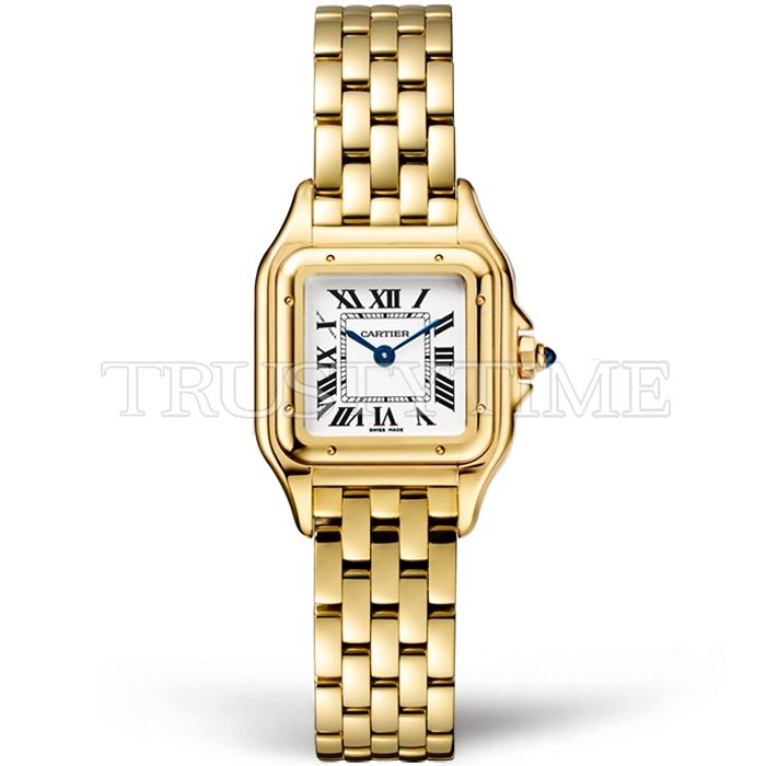 Часы Cartier из коллекции Panthere Secrete De Ladies. Классические женские часы Cartier Panthère Secrete Ladies 22 WGPN0008 премиального качества (Артикул магазина: CR-0465) оснащены надежным кварцевым механизмом (работает от батареи) калибра Swiss Quartz ETA, в котором реализованы следующие функции: часова и минутка стрелки, а так же максимально простой функционал без усложнений. Квадратный корпус часов цветы желтой золота, имеющий размер 22 мм х 30 мм и высоту 6 мм превосходно дополнит образ и украсит запястье своего обладателя. Для изготовления часов Cartier Panthère Secrete Ladies 22 WGPN0008 предлагаемых в нашем интернет-магазине, применяются нержавеющая сталь 316F высокого качества (Швейцарский стандарт), а так же сапфировое стекло высокой прочности, благодаря чему обеспечивается максимальная защита от сколов и механических повреждений. Отличительной чертой данной модели является белый циферблат, часовые индексы которого обеспечивают римские цифры. Завершает образ браслет из нержавеющей стали цвета желтого золота с фирменной раскладывающейся застежкой Cartier. Водонепроницаемость данной модели составляет 30М (WR30) – допускается минимальное воздействие с водой.