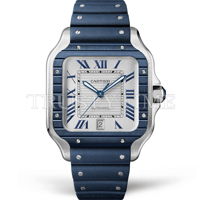 Часы Cartier из коллекции Santos De Cartier. Классические мужские часы Cartier Santos De Cartier Mens XL WSSA0047_0S7SW4A0 премиального качества (Артикул магазина: CR-0834) оснащены надежным автоматическим механизмом с автоподзаводом (работает от амплитуды движения руки) калибра MY9015, в котором реализованы следующие функции: часовая, минутная и секундная стрелки, а так же дата. Квадратный корпус часов стального цвета, имеющий размер 40 мм X 47.5 мм и высоту 9 мм превосходно дополнит образ и украсит запястье своего обладателя. Для изготовления часов Cartier Santos De Cartier Mens XL WSSA0047_0S7SW4A0 предлагаемых в нашем интернет-магазине, применяются нержавеющая сталь 316F высокого качества (Швейцарский стандарт), а так же сапфировое стекло высокой прочности, благодаря чему обеспечивается максимальная защита от сколов и механических повреждений. Отличительной чертой данной модели является белый циферблат, часовые индексы которого обеспечивают римские цифры. Завершает образ каучуковый ремешок синего цвета с фирменной раскладывающейся застежкой Cartier. Водонепроницаемость данной модели составляет 30М (WR30) – допускается минимальное воздействие с водой.