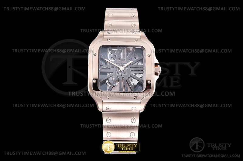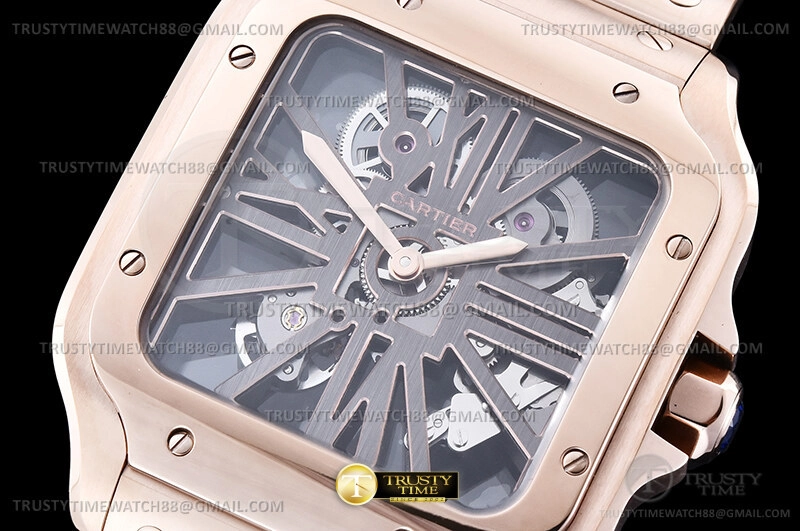 Часы Cartier из коллекции Santos De Cartier. Классические мужские часы Cartier Santos de Cartier Large Skeleton 40mm WHSA0016 премиального качества (Артикул магазина: CR-0988) оснащены надежным автоматическим механизмом с ручным заводом калибра 9611 MC, в котором реализованы следующие функции: часова и минутка стрелки, а так же максимально простой функционал без усложнений. Квадратный корпус часов розового цвета, имеющий размер 40 мм и высоту 10 мм превосходно дополнит образ и украсит запястье своего обладателя. Для изготовления часов Cartier Santos de Cartier Large Skeleton 40mm WHSA0016 предлагаемых в нашем интернет-магазине, применяются нержавеющая сталь 316F высокого качества (Швейцарский стандарт), а так же сапфировое стекло высокой прочности, благодаря чему обеспечивается максимальная защита от сколов и механических повреждений. Отличительной чертой данной модели является скелетонизированный циферблат, часовые индексы которого обеспечивают римские цифры. Завершает образ браслет из нержавеющей стали цвета розового золота с фирменной раскладывающейся застежкой Cartier. Водонепроницаемость данной модели составляет 30М (WR30) – допускается минимальное воздействие с водой.
