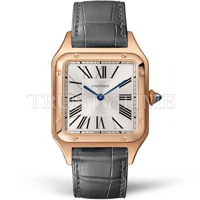 Часы Cartier из коллекции Santos Dumont. Классические мужские часы Cartier Santos Dumont Large 31 WGSA0021 премиального качества (Артикул магазина: CR-0460) оснащены надежным кварцевым механизмом (работает от батареи) калибра 157, в котором реализованы следующие функции: часова и минутка стрелки, а так же максимально простой функционал без усложнений. Квадратный корпус часов розового цвета, имеющий размер 43.5 мм x 31.4 мм и высоту 7 мм превосходно дополнит образ и украсит запястье своего обладателя. Для изготовления часов Cartier Santos Dumont Large 31 WGSA0021 предлагаемых в нашем интернет-магазине, применяются нержавеющая сталь 316L высокого качества (Швейцарский стандарт), а так же сапфировое стекло высокой прочности, благодаря чему обеспечивается максимальная защита от сколов и механических повреждений. Отличительной чертой данной модели является серебристый циферблат, часовые индексы которого обеспечивают римские цифры. Завершает образ кожаный ремешок серого цвета с фирменной раскладывающейся застежкой Cartier. Водонепроницаемость данной модели составляет 30М (WR30) – допускается минимальное воздействие с водой.