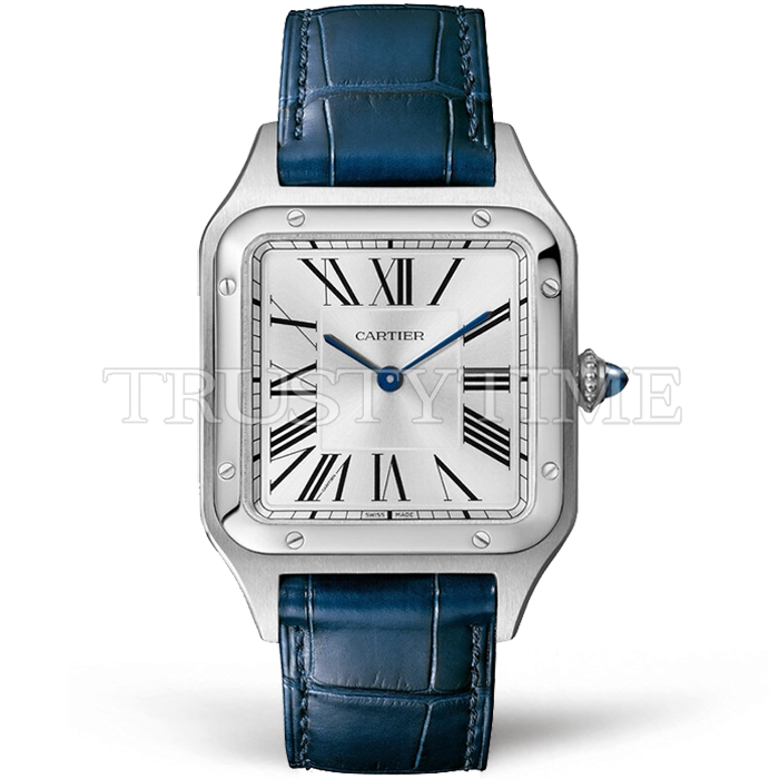 Часы Cartier из коллекции Santos Dumont. Классические мужские часы Cartier Santos Dumont Large 31 CRWSSA0022 премиального качества (Артикул магазина: CR-0462) оснащены надежным кварцевым механизмом (работает от батареи) калибра 157, в котором реализованы следующие функции: часова и минутка стрелки, а так же максимально простой функционал без усложнений. Квадратный корпус часов стального цвета, имеющий размер 43.5 мм x 31.4 мм и высоту 7 мм превосходно дополнит образ и украсит запястье своего обладателя. Для изготовления часов Cartier Santos Dumont Large 31 CRWSSA0022 предлагаемых в нашем интернет-магазине, применяются нержавеющая сталь 316L высокого качества (Швейцарский стандарт), а так же сапфировое стекло высокой прочности, благодаря чему обеспечивается максимальная защита от сколов и механических повреждений. Отличительной чертой данной модели является серебристый циферблат, часовые индексы которого обеспечивают римские цифры. Завершает образ кожаный ремешок синего цвета с фирменной раскладывающейся застежкой Cartier. Водонепроницаемость данной модели составляет 30М (WR30) – допускается минимальное воздействие с водой.