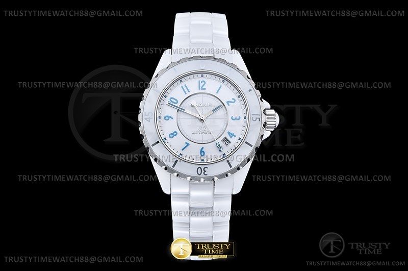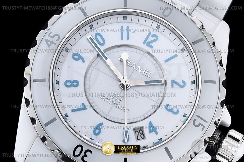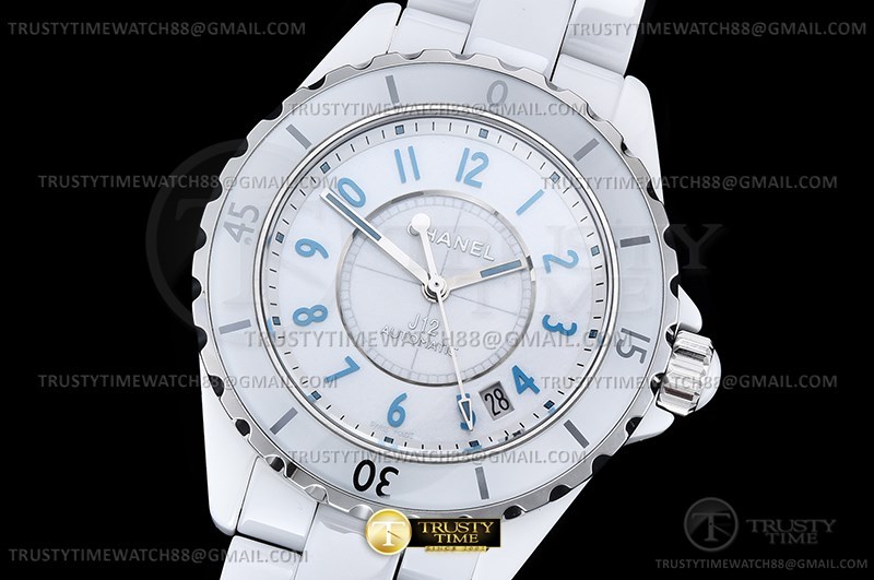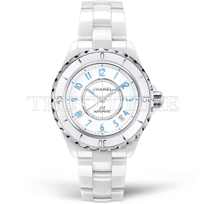 Часы Chanel из коллекции J-12. Классические женские часы Chanel J-12 Blue Light 38 H3827 премиального качества (Артикул магазина: CN-0282) оснащены надежным автоматическим механизмом с автоподзаводом (работает от амплитуды движения руки) калибра ETA2892, в котором реализованы следующие функции: часовая, минутная и секундная стрелки, а так же дата. Круглый корпус часов белого цвета, имеющий размер 38 мм и высоту 12.6 мм превосходно дополнит образ и украсит запястье своего обладателя. Для изготовления часов Chanel J-12 Blue Light 38 H3827 предлагаемых в нашем интернет-магазине, применяются керамика высокого качества (Швейцарский стандарт), а так же сапфировое стекло высокой прочности, благодаря чему обеспечивается максимальная защита от сколов и механических повреждений. Отличительной чертой данной модели является белый циферблат, часовые индексы которого обеспечивают арабские цифры. Завершает образ керамический браслет белого цвета с фирменной раскладывающейся застежкой Chanel. Водонепроницаемость данной модели составляет 30М (WR30) – допускается минимальное воздействие с водой.