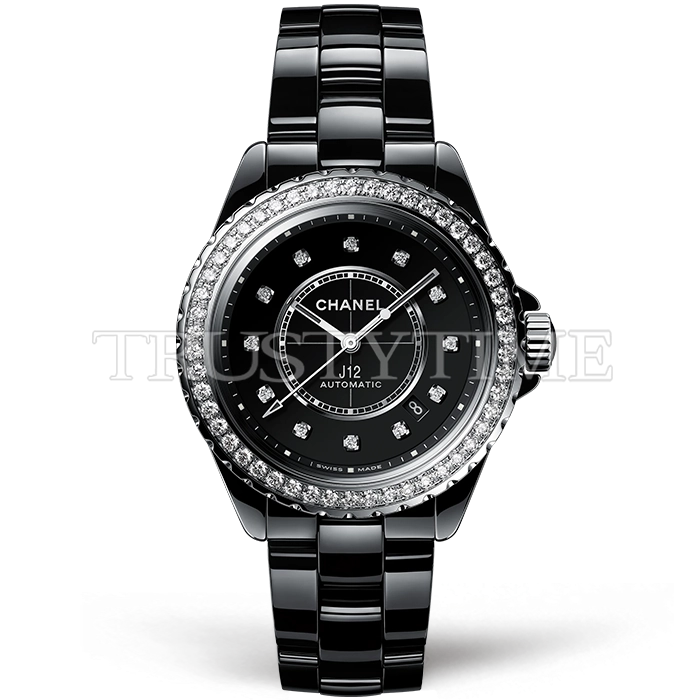 Часы Chanel из коллекции J-12. Классические женские часы Chanel J-12 Diamond Bezel 38 H6526 премиального качества (Артикул магазина: CN-0286) оснащены надежным автоматическим механизмом с автоподзаводом (работает от амплитуды движения руки) калибра 12.1, в котором реализованы следующие функции: часовая, минутная и секундная стрелки, а так же дата. Круглый корпус часов черного цвета, имеющий размер 38 мм и высоту 12.6 мм превосходно дополнит образ и украсит запястье своего обладателя. Для изготовления часов Chanel J-12 Diamond Bezel 38 H6526 предлагаемых в нашем интернет-магазине, применяются керамика высокого качества (Швейцарский стандарт), а так же сапфировое стекло высокой прочности, благодаря чему обеспечивается максимальная защита от сколов и механических повреждений. Отличительной чертой данной модели является черный циферблат, часовые индексы которого обеспечивают камни. Завершает образ керамический браслет черного цвета с фирменной раскладывающейся застежкой Chanel. Водонепроницаемость данной модели составляет 30М (WR30) – допускается минимальное воздействие с водой.