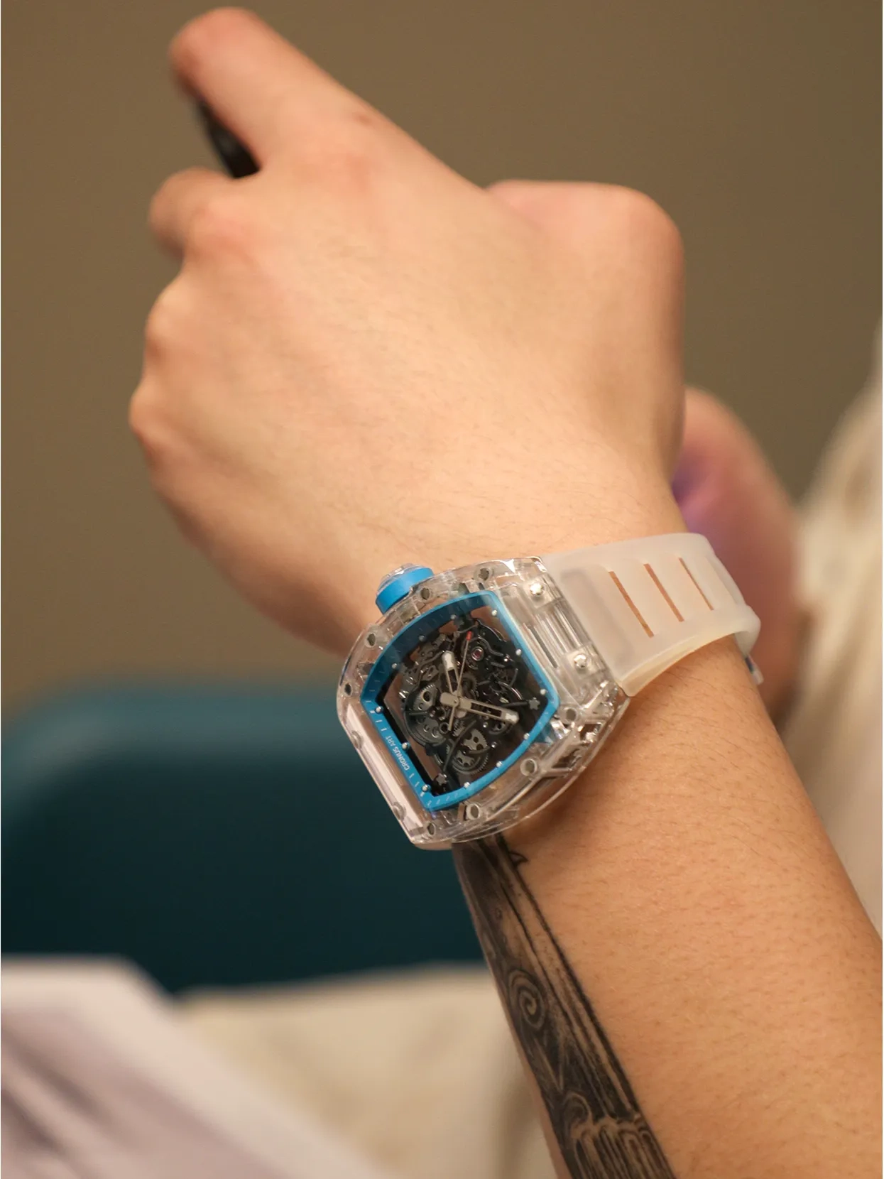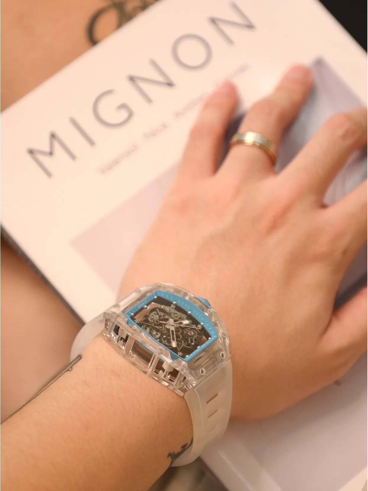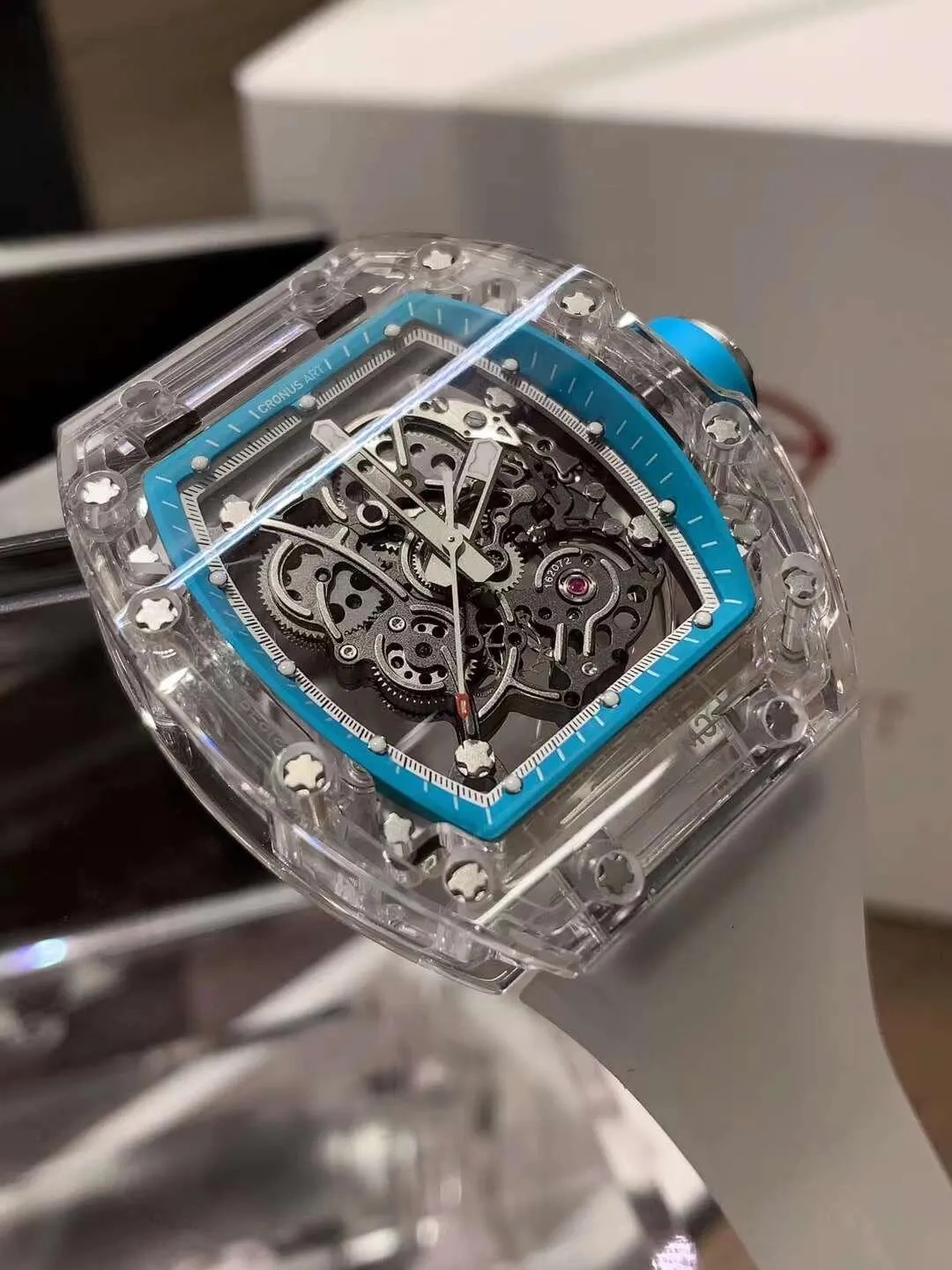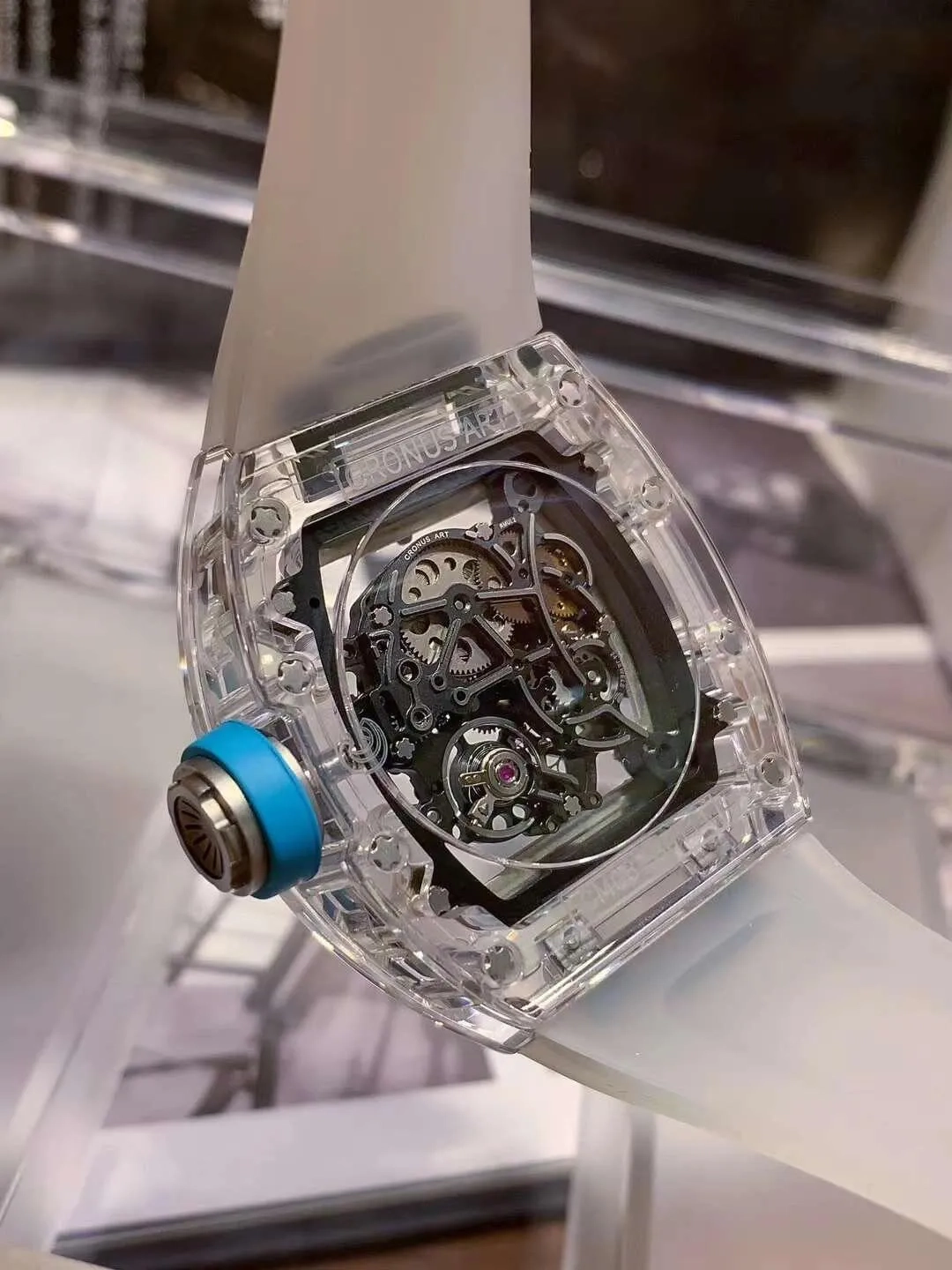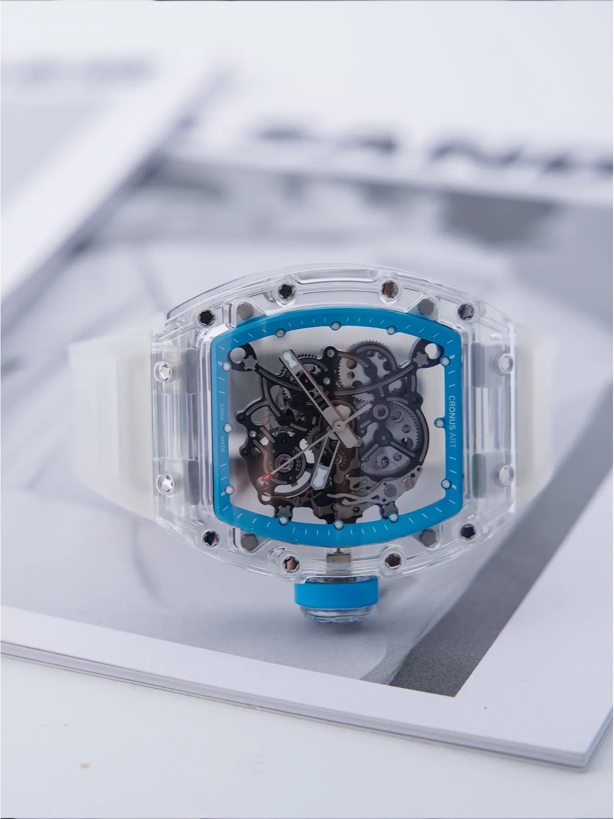 Часы CronusArt из коллекции . Спортивные мужские часы CronusArt Sapphire Watch CM055-01 Оригинал (Артикул магазина: CA-0451) оснащены надежным автоматическим механизмом с ручным заводом калибра CronusArt Customized Calibre, в котором реализованы следующие функции: часовая, минутная и секундная стрелки, а так же максимально простой функционал без усложнений. Бочкообразный корпус часов прозрачного цвета, имеющий размер 42 мм X 50 мм и высоту 13.4 мм превосходно дополнит образ и украсит запястье своего обладателя. Для изготовления часов CronusArt Sapphire Watch CM055-01 предлагаемых в нашем интернет-магазине, применяются сапфир высокого качества (Швейцарский стандарт), а так же сапфировое стекло высокой прочности, благодаря чему обеспечивается максимальная защита от сколов и механических повреждений. Отличительной чертой данной модели является скелетонизированный циферблат, часовые индексы которого обеспечивают часовые метки. Завершает образ каучуковый ремешок белого цвета с фирменной раскладывающейся застежкой CronusArt. Водонепроницаемость данной модели составляет .