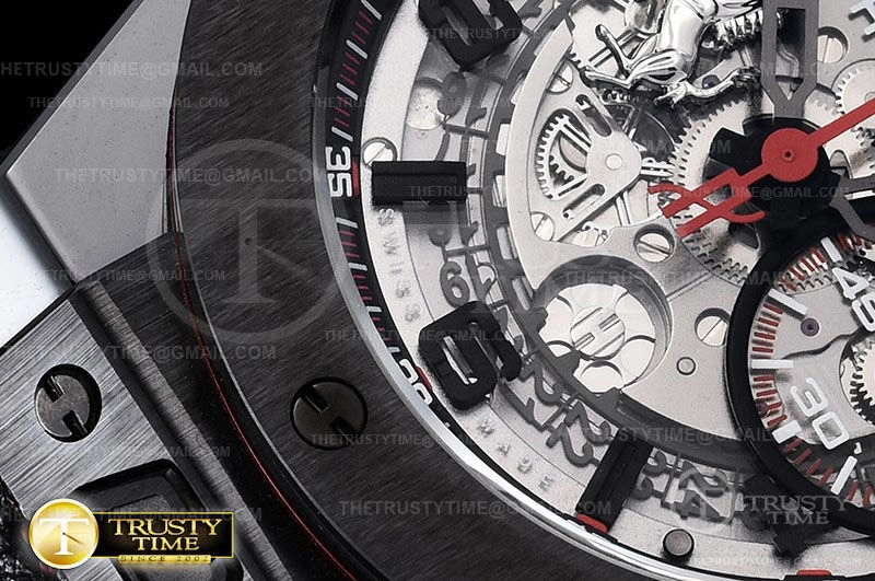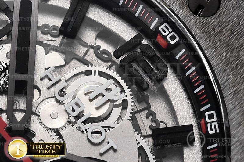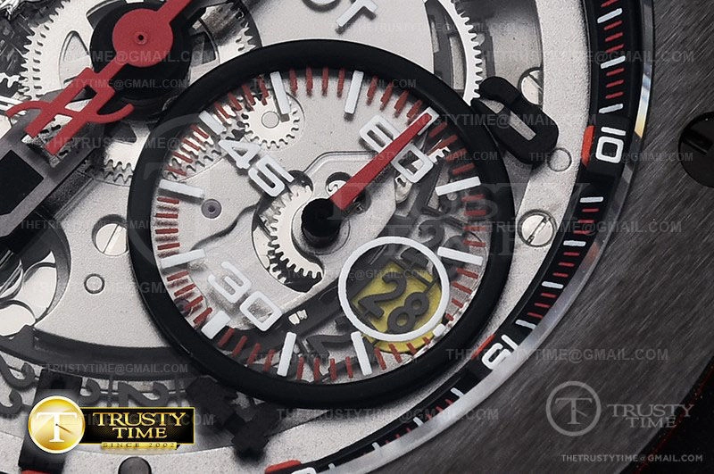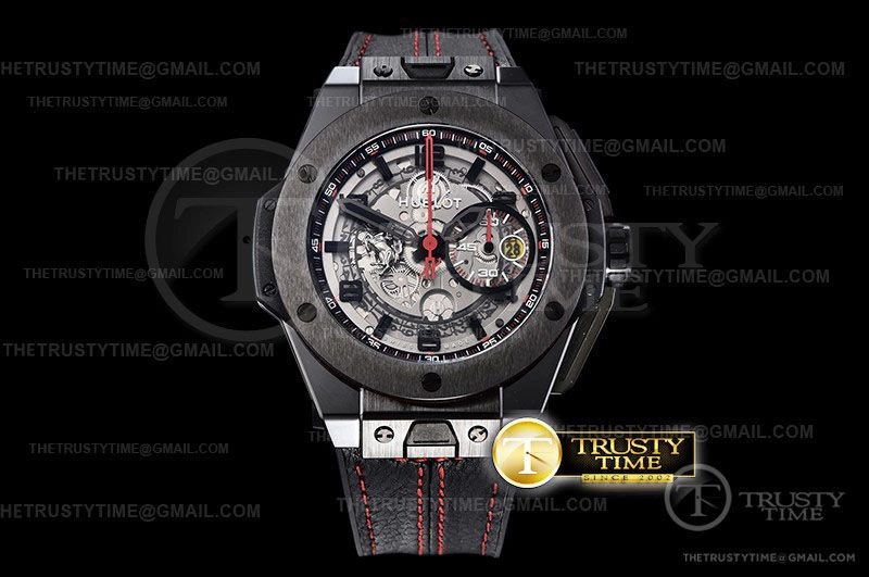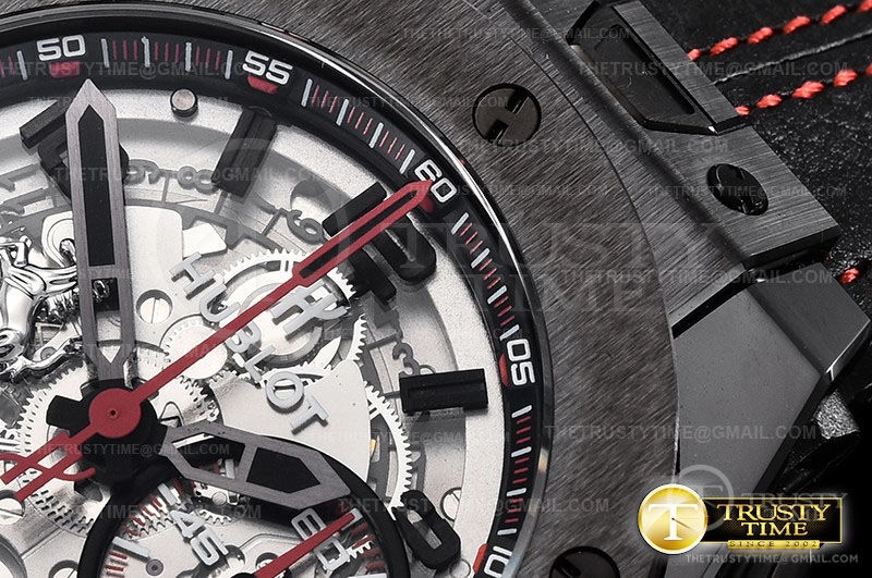 Часы Hublot из коллекции Big Bang Ferrari. Спортивные мужские часы Hublot Big Bang Unico Ferrari Limited Edition 401.CX.0123.VR премиального качества (Артикул магазина: HB-0424) оснащены надежным автоматическим механизмом с автоподзаводом (работает от амплитуды движения руки) калибра HUB1288, в котором реализованы следующие функции: часовая, минутная и секундная стрелки, а так же хронограф, дата. Круглый корпус часов черного цвета, имеющий размер 45 мм и высоту 17 мм превосходно дополнит образ и украсит запястье своего обладателя. Для изготовления часов Hublot Big Bang Unico Ferrari Limited Edition 401.CX.0123.VR предлагаемых в нашем интернет-магазине, применяются керамика высокого качества (Швейцарский стандарт), а так же сапфировое стекло высокой прочности, благодаря чему обеспечивается максимальная защита от сколов и механических повреждений. Отличительной чертой данной модели является скелетонизированный циферблат, часовые индексы которого обеспечивают часовые метки. Завершает образ кожаный ремешок черного цвета с фирменной раскладывающейся застежкой Hublot. Водонепроницаемость данной модели составляет 30М (WR30) – допускается минимальное воздействие с водой.
