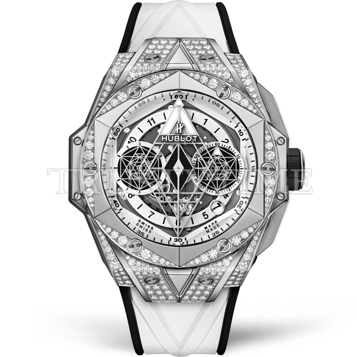 Часы Hublot из коллекции Big Bang Sang Bleu. Спортивные мужские часы Hublot Big Bang Sang Bleu II 45mm 418.NX.2001.RX.1604.MXM20 премиального качества (Артикул магазина: HB-1071) оснащены надежным автоматическим механизмом с автоподзаводом (работает от амплитуды движения руки) калибра HUB1240, в котором реализованы следующие функции: часовая, минутная и секундная стрелки, а так же хронограф, дата. Многогранный корпус часов стального цвета, имеющий размер 45 мм и высоту 14 мм превосходно дополнит образ и украсит запястье своего обладателя. Для изготовления часов Hublot Big Bang Sang Bleu II 45mm 418.NX.2001.RX.1604.MXM20 предлагаемых в нашем интернет-магазине, применяются титан высокого качества (Швейцарский стандарт), а так же сапфировое стекло высокой прочности, благодаря чему обеспечивается максимальная защита от сколов и механических повреждений. Отличительной чертой данной модели является белый циферблат, часовые индексы которого обеспечивают арабские цифры, часовые индексы которого обеспечивают часовые метки. Завершает образ каучуковый ремешок белого цвета с фирменной раскладывающейся застежкой Hublot. Водонепроницаемость данной модели составляет 30М (WR30) – допускается минимальное воздействие с водой.
