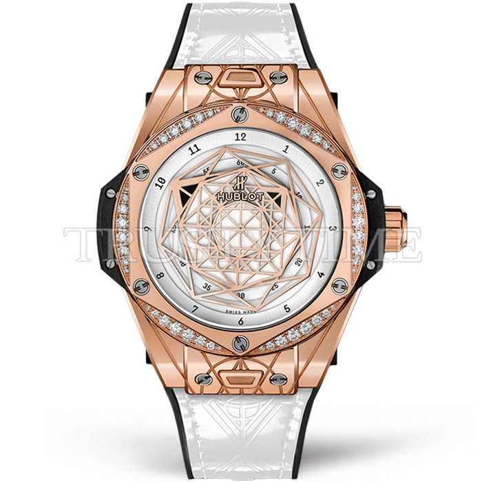 Часы Hublot из коллекции Big Bang Sang Bleu One Click. Спортивные мужские часы Hublot Big Bang Sang Bleu One Click 39mm 465.OS.2028.VR.1204 премиального качества (Артикул магазина: HB-1075) оснащены надежным автоматическим механизмом с автоподзаводом (работает от амплитуды движения руки) калибра HUB1710, в котором реализованы следующие функции: часова и минутка стрелки, а так же максимально простой функционал без усложнений. Круглый корпус часов розового цвета, имеющий размер 39 мм и высоту 12.5 мм превосходно дополнит образ и украсит запястье своего обладателя. Для изготовления часов Hublot Big Bang Sang Bleu One Click 39mm 465.OS.2028.VR.1204 предлагаемых в нашем интернет-магазине, применяются нержавеющая сталь 316L высокого качества (Швейцарский стандарт), а так же сапфировое стекло высокой прочности, благодаря чему обеспечивается максимальная защита от сколов и механических повреждений. Отличительной чертой данной модели является белый циферблат, часовые индексы которого обеспечивают часовые метки. Завершает образ кожаный ремешок белого цвета с фирменной раскладывающейся застежкой Hublot. Водонепроницаемость данной модели составляет 30М (WR30) – допускается минимальное воздействие с водой.
