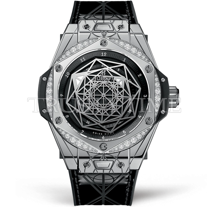 Часы Hublot из коллекции Big Bang Sang Bleu One Click. Спортивные мужские часы Hublot Big Bang Sang Bleu One Click 39mm 465.SS.1117.VR.1204 премиального качества (Артикул магазина: HB-1079) оснащены надежным автоматическим механизмом с автоподзаводом (работает от амплитуды движения руки) калибра HUB1710, в котором реализованы следующие функции: часова и минутка стрелки, а так же максимально простой функционал без усложнений. Круглый корпус часов стального цвета, имеющий размер 39 мм и высоту 12.5 мм превосходно дополнит образ и украсит запястье своего обладателя. Для изготовления часов Hublot Big Bang Sang Bleu One Click 39mm 465.SS.1117.VR.1204 предлагаемых в нашем интернет-магазине, применяются титан высокого качества (Швейцарский стандарт), а так же сапфировое стекло высокой прочности, благодаря чему обеспечивается максимальная защита от сколов и механических повреждений. Отличительной чертой данной модели является черный циферблат, часовые индексы которого обеспечивают часовые метки. Завершает образ кожаный ремешок черного цвета с фирменной раскладывающейся застежкой Hublot. Водонепроницаемость данной модели составляет 30М (WR30) – допускается минимальное воздействие с водой.
