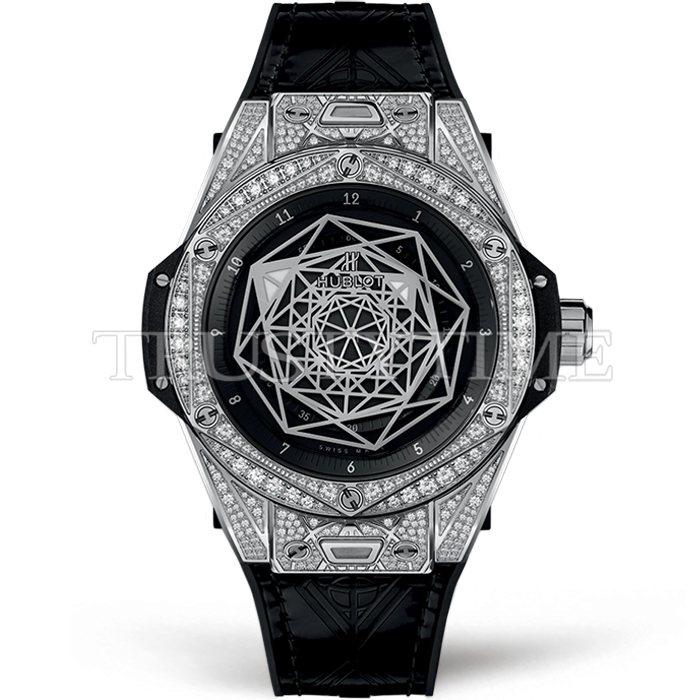 Часы Hublot из коллекции Big Bang Sang Bleu One Click. Спортивные мужские часы Hublot Big Bang Sang Bleu One Click 39mm 465.SS.1117.VR.1704 премиального качества (Артикул магазина: HB-1080) оснащены надежным автоматическим механизмом с автоподзаводом (работает от амплитуды движения руки) калибра HUB1710, в котором реализованы следующие функции: часова и минутка стрелки, а так же максимально простой функционал без усложнений. Круглый корпус часов стального цвета, имеющий размер 39 мм и высоту 12.5 мм превосходно дополнит образ и украсит запястье своего обладателя. Для изготовления часов Hublot Big Bang Sang Bleu One Click 39mm 465.SS.1117.VR.1704 предлагаемых в нашем интернет-магазине, применяются титан высокого качества (Швейцарский стандарт), а так же сапфировое стекло высокой прочности, благодаря чему обеспечивается максимальная защита от сколов и механических повреждений. Отличительной чертой данной модели является черный циферблат, часовые индексы которого обеспечивают часовые метки. Завершает образ кожаный ремешок черного цвета с фирменной раскладывающейся застежкой Hublot. Водонепроницаемость данной модели составляет 30М (WR30) – допускается минимальное воздействие с водой.