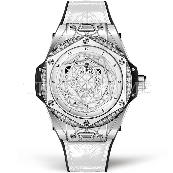 Часы Hublot из коллекции Big Bang Sang Bleu One Click. Спортивные мужские часы Hublot Big Bang Sang Bleu One Click 39mm 465.SS.2027.VR.1204 премиального качества (Артикул магазина: HB-1081) оснащены надежным автоматическим механизмом с автоподзаводом (работает от амплитуды движения руки) калибра HUB1710, в котором реализованы следующие функции: часова и минутка стрелки, а так же максимально простой функционал без усложнений. Круглый корпус часов стального цвета, имеющий размер 39 мм и высоту 12.5 мм превосходно дополнит образ и украсит запястье своего обладателя. Для изготовления часов Hublot Big Bang Sang Bleu One Click 39mm 465.SS.2027.VR.1204 предлагаемых в нашем интернет-магазине, применяются титан высокого качества (Швейцарский стандарт), а так же сапфировое стекло высокой прочности, благодаря чему обеспечивается максимальная защита от сколов и механических повреждений. Отличительной чертой данной модели является белый циферблат, часовые индексы которого обеспечивают часовые метки. Завершает образ кожаный ремешок белого цвета с фирменной раскладывающейся застежкой Hublot. Водонепроницаемость данной модели составляет 30М (WR30) – допускается минимальное воздействие с водой.