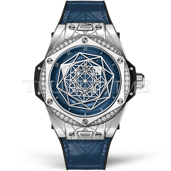 Часы Hublot из коллекции Big Bang Sang Bleu One Click. Спортивные мужские часы Hublot Big Bang Sang Bleu One Click 39mm 465.SS.7179.VR.1204 премиального качества (Артикул магазина: HB-1083) оснащены надежным автоматическим механизмом с автоподзаводом (работает от амплитуды движения руки) калибра HUB1710, в котором реализованы следующие функции: часова и минутка стрелки, а так же максимально простой функционал без усложнений. Круглый корпус часов стального цвета, имеющий размер 39 мм и высоту 12.5 мм превосходно дополнит образ и украсит запястье своего обладателя. Для изготовления часов Hublot Big Bang Sang Bleu One Click 39mm 465.SS.7179.VR.1204 предлагаемых в нашем интернет-магазине, применяются титан высокого качества (Швейцарский стандарт), а так же сапфировое стекло высокой прочности, благодаря чему обеспечивается максимальная защита от сколов и механических повреждений. Отличительной чертой данной модели является синий циферблат, часовые индексы которого обеспечивают часовые метки. Завершает образ кожаный ремешок синего цвета с фирменной раскладывающейся застежкой Hublot. Водонепроницаемость данной модели составляет 30М (WR30) – допускается минимальное воздействие с водой.