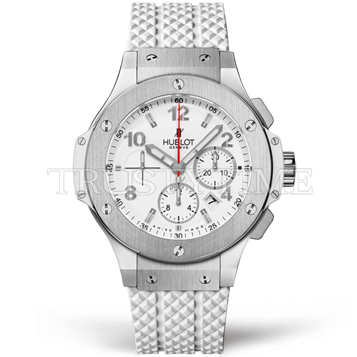 Часы Hublot из коллекции Big Bang. Спортивные мужские часы Hublot Big Bang Chronograph 44mm 301.SE.230.RW премиального качества (Артикул магазина: HB-0843) оснащены надежным автоматическим механизмом с автоподзаводом (работает от амплитуды движения руки) калибра HUB4100, в котором реализованы следующие функции: часовая, минутная и секундная стрелки, а так же хронограф, дата. Круглый корпус часов стального цвета, имеющий размер 44.5 мм и высоту 14.5 мм превосходно дополнит образ и украсит запястье своего обладателя. Для изготовления часов Hublot Big Bang Chronograph 44mm 301.SE.230.RW предлагаемых в нашем интернет-магазине, применяются нержавеющая сталь 316L высокого качества (Швейцарский стандарт), а так же сапфировое стекло высокой прочности, благодаря чему обеспечивается максимальная защита от сколов и механических повреждений. Отличительной чертой данной модели является белый циферблат, часовые индексы которого обеспечивают арабские цифры, часовые индексы которого обеспечивают часовые метки. Завершает образ каучуковый ремешок белого цвета с фирменной раскладывающейся застежкой Hublot. Водонепроницаемость данной модели составляет 30М (WR30) – допускается минимальное воздействие с водой.