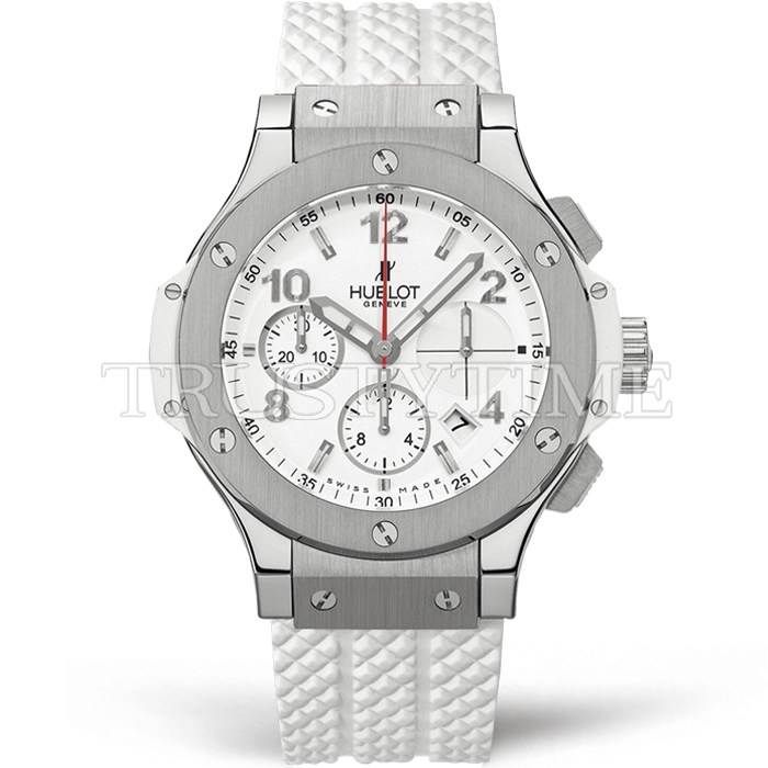 Часы Hublot из коллекции Big Bang. Спортивные женские часы Hublot Big Bang 41 341.SE.230.RW премиального качества (Артикул магазина: HB-1051) оснащены надежным автоматическим механизмом с автоподзаводом (работает от амплитуды движения руки) калибра HUB4100, в котором реализованы следующие функции: часовая, минутная и секундная стрелки, а так же хронограф, дата. Круглый корпус часов стального цвета, имеющий размер 41 мм и высоту 13 мм превосходно дополнит образ и украсит запястье своего обладателя. Для изготовления часов Hublot Big Bang 41 341.SE.230.RW предлагаемых в нашем интернет-магазине, применяются нержавеющая сталь 316L высокого качества (Швейцарский стандарт), а так же сапфировое стекло высокой прочности, благодаря чему обеспечивается максимальная защита от сколов и механических повреждений. Отличительной чертой данной модели является белый циферблат, часовые индексы которого обеспечивают арабские цифры, часовые индексы которого обеспечивают часовые метки. Завершает образ каучуковый ремешок белого цвета с фирменной раскладывающейся застежкой Hublot. Водонепроницаемость данной модели составляет 30М (WR30) – допускается минимальное воздействие с водой.