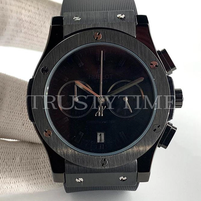 Часы Hublot из коллекции Classic Fusion Chronograph. Спортивные мужские часы Hublot Classic Fusion Chronograph качества ААА+ (Артикул магазина: HB-0104) оснащены надежным кварцевым механизмом (работает от батареи) калибра Quartz ETA 256.031, в котором реализованы следующие функции: часовая, минутная и секундная стрелки, а так же хронограф, дата. Круглый корпус часов черного цвета, имеющий размер 42 мм и высоту 12 мм превосходно дополнит образ и украсит запястье своего обладателя. Для изготовления часов Hublot Classic Fusion Chronograph предлагаемых в нашем интернет-магазине, применяются нержавеющая сталь 316L высокого качества (Швейцарский стандарт), а так же сапфировое стекло высокой прочности, благодаря чему обеспечивается максимальная защита от сколов и механических повреждений. Отличительной чертой данной модели является черный циферблат, часовые индексы которого обеспечивают часовые метки. Завершает образ каучуковый ремешок черного цвета с фирменной раскладывающейся застежкой Hublot. Водонепроницаемость данной модели составляет 30М (WR30) – допускается минимальное воздействие с водой.