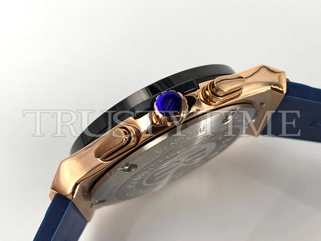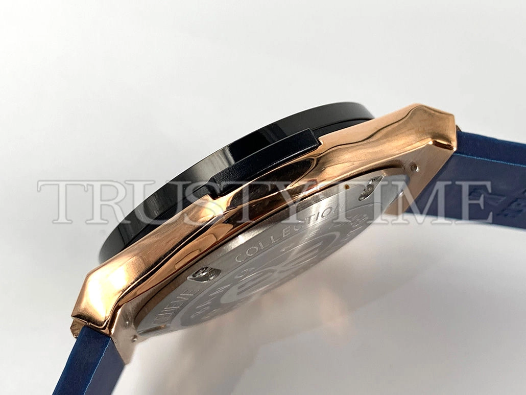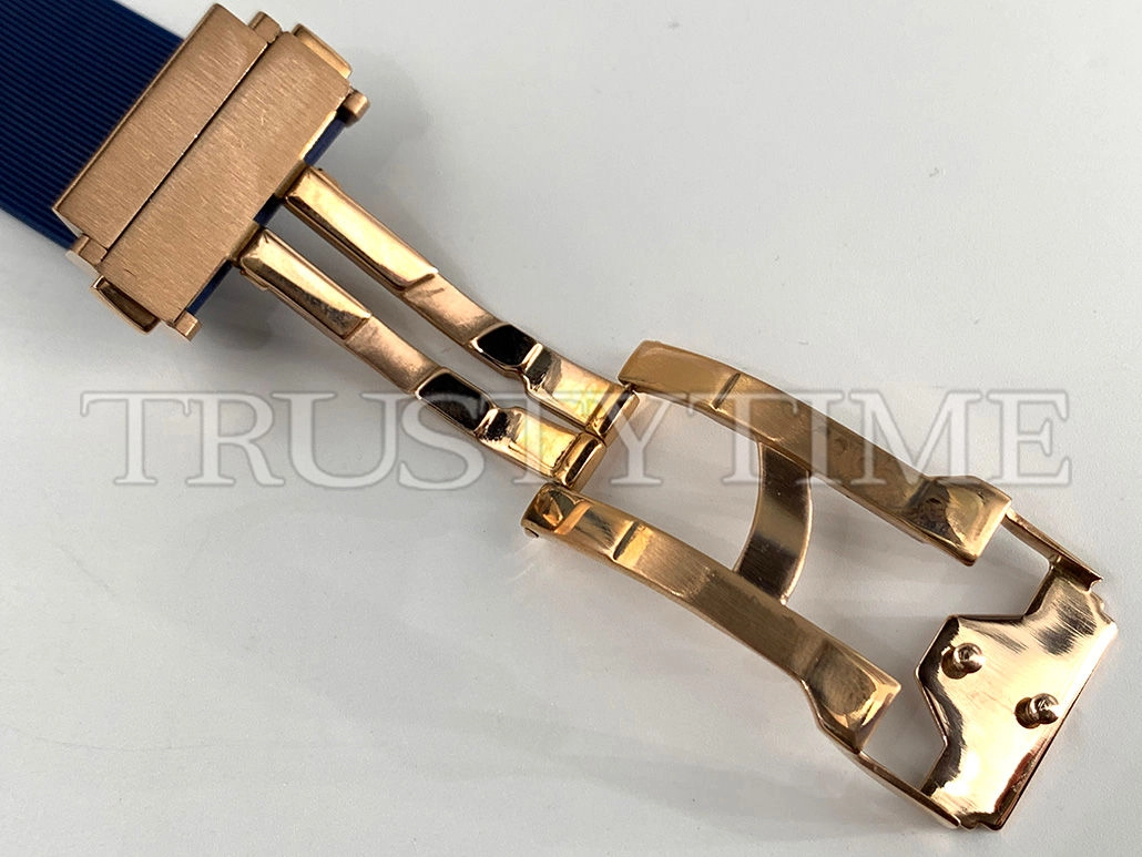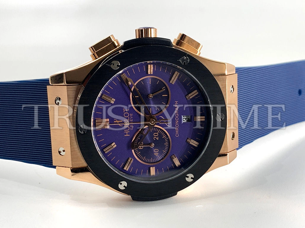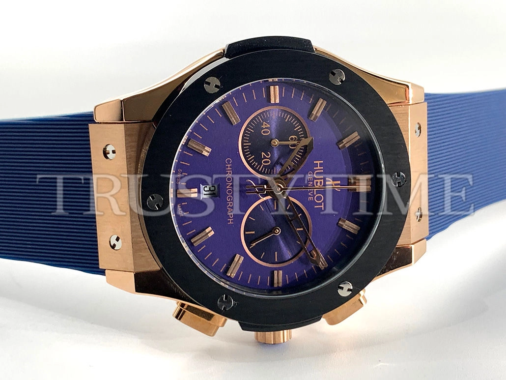 Часы Hublot из коллекции Classic Fusion Chronograph. Спортивные мужские часы Hublot Classic Fusion Chronograph качества ААА+ (Артикул магазина: HB-0112) оснащены надежным кварцевым механизмом (работает от батареи) калибра Quartz ETA 256.031, в котором реализованы следующие функции: часовая, минутная и секундная стрелки, а так же хронограф, дата. Круглый корпус часов розового цвета, имеющий размер 42 мм и высоту 12 мм превосходно дополнит образ и украсит запястье своего обладателя. Для изготовления часов Hublot Classic Fusion Chronograph предлагаемых в нашем интернет-магазине, применяются нержавеющая сталь 316L высокого качества (Швейцарский стандарт), а так же сапфировое стекло высокой прочности, благодаря чему обеспечивается максимальная защита от сколов и механических повреждений. Отличительной чертой данной модели является синий циферблат, часовые индексы которого обеспечивают часовые метки. Завершает образ каучуковый ремешок синего цвета с фирменной раскладывающейся застежкой Hublot. Водонепроницаемость данной модели составляет 30М (WR30) – допускается минимальное воздействие с водой.