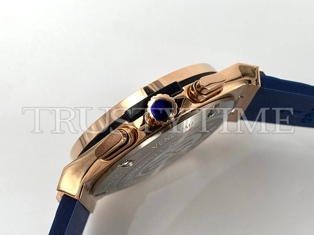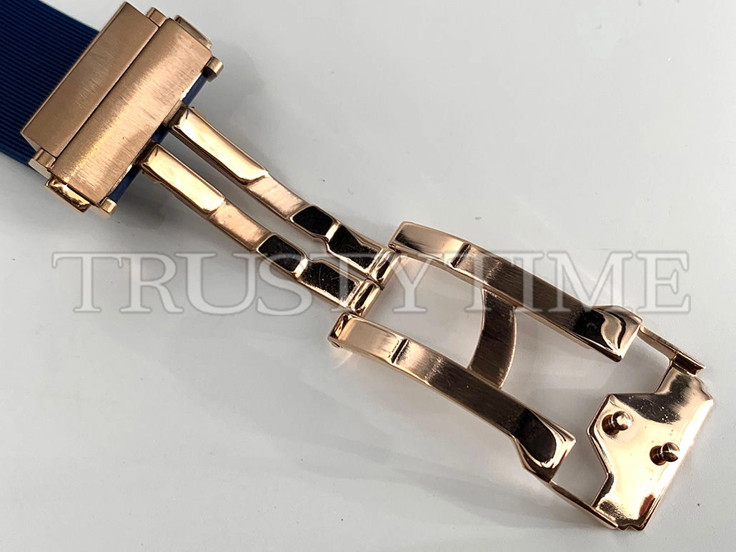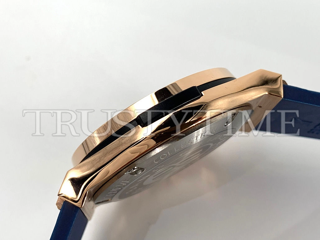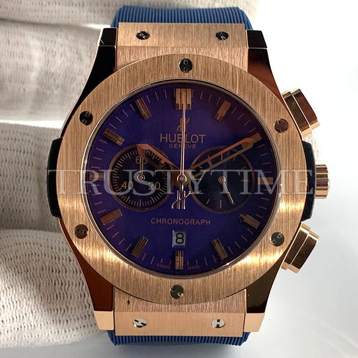 Часы Hublot из коллекции Classic Fusion Chronograph. Спортивные мужские часы Hublot Classic Fusion Chronograph качества ААА+ (Артикул магазина: HB-0115) оснащены надежным кварцевым механизмом (работает от батареи) калибра Quartz ETA 256.031, в котором реализованы следующие функции: часовая, минутная и секундная стрелки, а так же хронограф, дата. Круглый корпус часов розового цвета, имеющий размер 42 мм и высоту 12 мм превосходно дополнит образ и украсит запястье своего обладателя. Для изготовления часов Hublot Classic Fusion Chronograph предлагаемых в нашем интернет-магазине, применяются нержавеющая сталь 316L высокого качества (Швейцарский стандарт), а так же сапфировое стекло высокой прочности, благодаря чему обеспечивается максимальная защита от сколов и механических повреждений. Отличительной чертой данной модели является синий циферблат, часовые индексы которого обеспечивают часовые метки. Завершает образ каучуковый ремешок синего цвета с фирменной раскладывающейся застежкой Hublot. Водонепроницаемость данной модели составляет 30М (WR30) – допускается минимальное воздействие с водой.