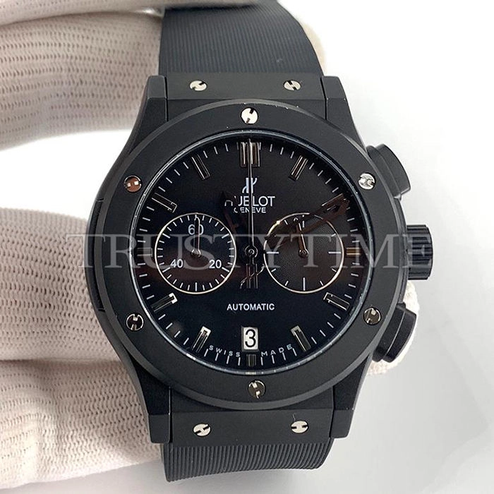 Часы Hublot из коллекции Classic Fusion Chronograph. Спортивные мужские часы Hublot Classic Fusion Chronograph качества ААА+ (Артикул магазина: HB-0595) оснащены надежным кварцевым механизмом (работает от батареи) калибра Quartz ETA 256.031, в котором реализованы следующие функции: часовая, минутная и секундная стрелки, а так же хронограф, дата. Круглый корпус часов черного цвета, имеющий размер 42 мм и высоту 14 мм превосходно дополнит образ и украсит запястье своего обладателя. Для изготовления часов Hublot Classic Fusion Chronograph предлагаемых в нашем интернет-магазине, применяются нержавеющая сталь 316L высокого качества (Швейцарский стандарт), а так же сапфировое стекло высокой прочности, благодаря чему обеспечивается максимальная защита от сколов и механических повреждений. Отличительной чертой данной модели является черный циферблат, часовые индексы которого обеспечивают часовые метки. Завершает образ каучуковый ремешок черного цвета с фирменной раскладывающейся застежкой Hublot. Водонепроницаемость данной модели составляет 30М (WR30) – допускается минимальное воздействие с водой.