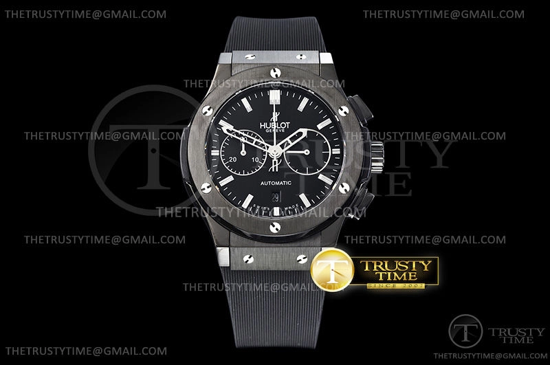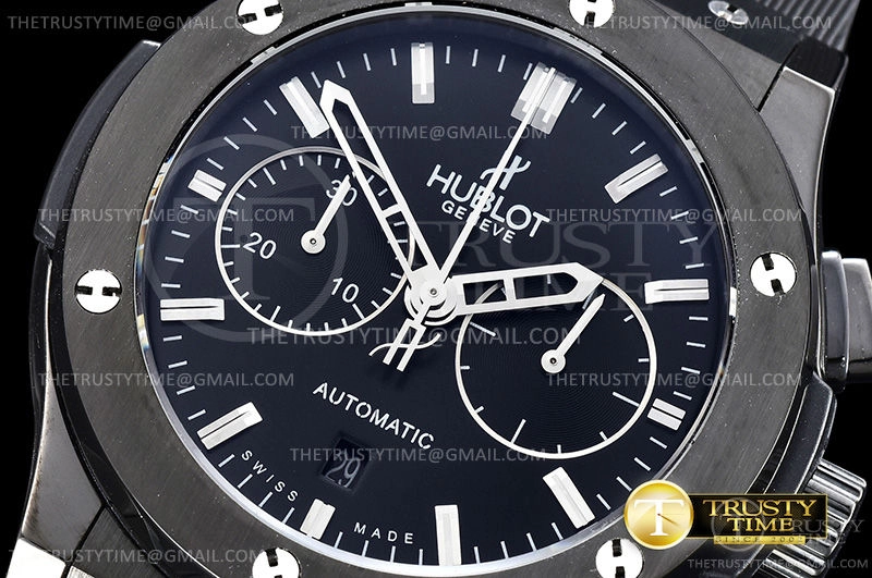 Часы Hublot из коллекции Classic Fusion Chronograph. Спортивные мужские часы Hublot Fusion Chronograph 45mm 521.CM.1171.RX премиального качества (Артикул магазина: HB-0526) оснащены надежным автоматическим механизмом с автоподзаводом (работает от амплитуды движения руки) калибра Valjoux-7750, в котором реализованы следующие функции: часовая, минутная и секундная стрелки, а так же хронограф, дата. Круглый корпус часов черного цвета, имеющий размер 45 мм и высоту 15.5 мм превосходно дополнит образ и украсит запястье своего обладателя. Для изготовления часов Hublot Fusion Chronograph 45mm 521.CM.1171.RX предлагаемых в нашем интернет-магазине, применяются нержавеющая сталь 316F высокого качества (Швейцарский стандарт), а так же сапфировое стекло высокой прочности, благодаря чему обеспечивается максимальная защита от сколов и механических повреждений. Отличительной чертой данной модели является черный циферблат, часовые индексы которого обеспечивают часовые метки. Завершает образ каучуковый ремешок черного цвета с фирменной раскладывающейся застежкой Hublot. Водонепроницаемость данной модели составляет 30М (WR30) – допускается минимальное воздействие с водой.
