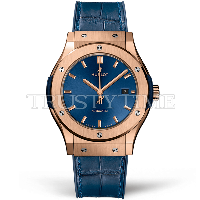 Часы Hublot из коллекции Classic Fusion. Классические мужские часы Hublot Classic Fusion 42mm 542.OX.7180.LR премиального качества (Артикул магазина: HB-1129) оснащены надежным автоматическим механизмом с автоподзаводом (работает от амплитуды движения руки) калибра HUB1100, в котором реализованы следующие функции: часовая, минутная и секундная стрелки, а так же дата. Круглый корпус часов розового цвета, имеющий размер 42 мм и высоту 9.5 мм превосходно дополнит образ и украсит запястье своего обладателя. Для изготовления часов Hublot Classic Fusion 42mm 542.OX.7180.LR предлагаемых в нашем интернет-магазине, применяются нержавеющая сталь 316L высокого качества (Швейцарский стандарт), а так же сапфировое стекло высокой прочности, благодаря чему обеспечивается максимальная защита от сколов и механических повреждений. Отличительной чертой данной модели является синий циферблат, часовые индексы которого обеспечивают часовые метки. Завершает образ кожаный ремешок синего цвета с фирменной раскладывающейся застежкой Hublot. Водонепроницаемость данной модели составляет 30М (WR30) – допускается минимальное воздействие с водой.